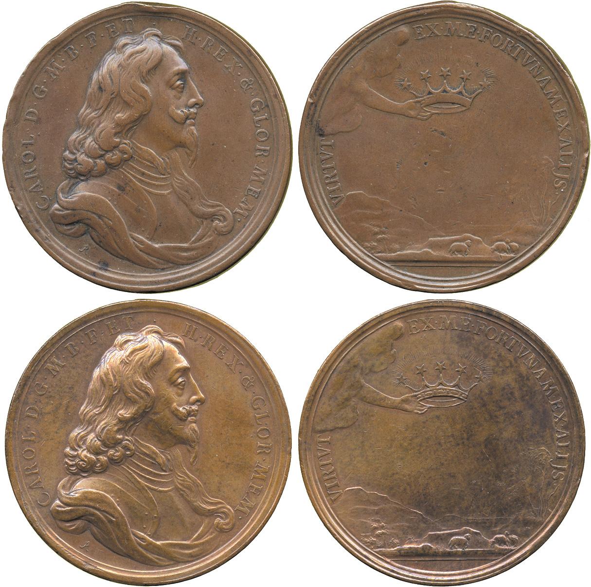 COMMEMORATIVE MEDALS. BRITISH HISTORICAL MEDALS. Charles I (1625-1649), Memorial, Copper Medals (2), by J Roettier, after the restoration, bust right, rev celestial hand with crown (MI 346/200). Very fine. (2)