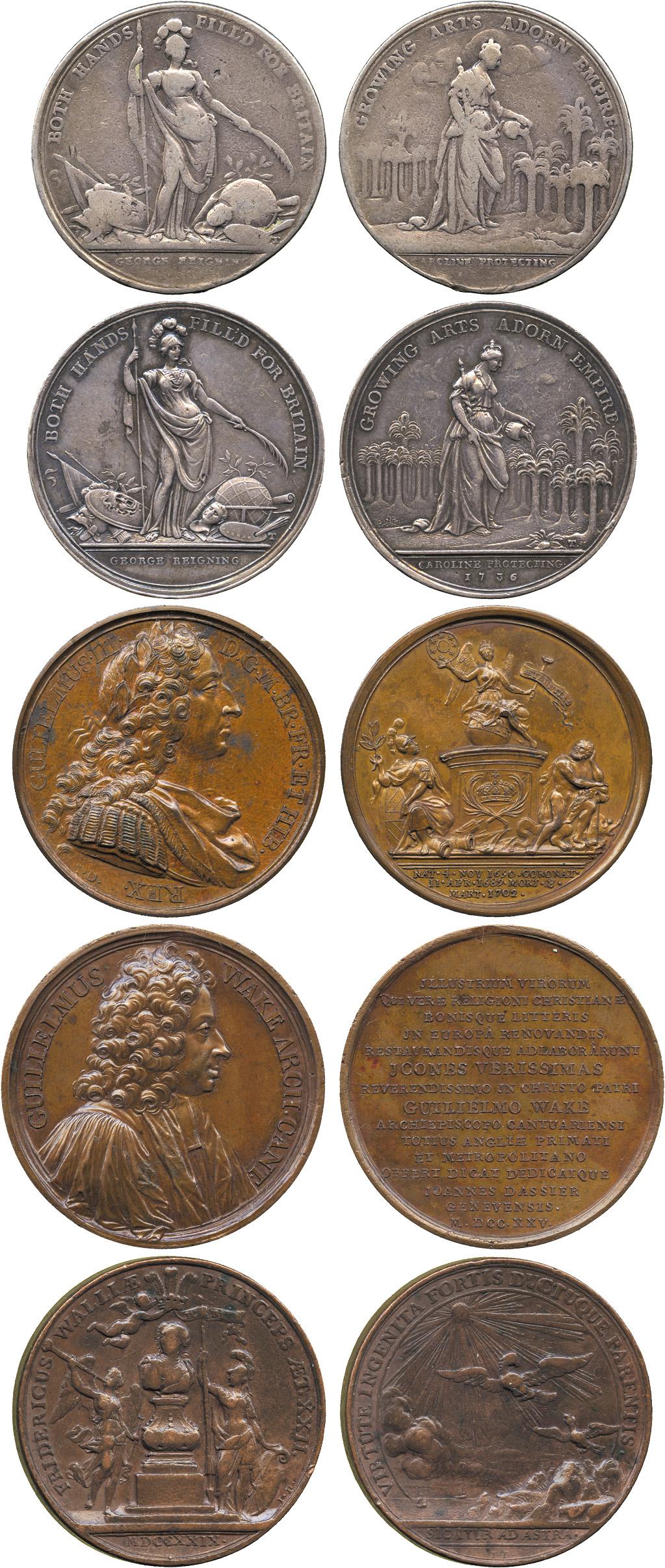 COMMEMORATIVE MEDALS. BRITISH HISTORICAL MEDALS. Copper Medals by Jean Dassier (3), Archbishop William Wake, Dedication Medal, 1725, bust right, 42mm (MI 462/73); William III, series of kings and queens, 41mm (MI 225/554); Prince Frederick, Prince of Wales, 1729, 40mm (MI 489/29), last fine, others extremely fine or nearly so; Jernegan’s Lottery, Silver Tickets (2), 1736, fair and very fine. (5)