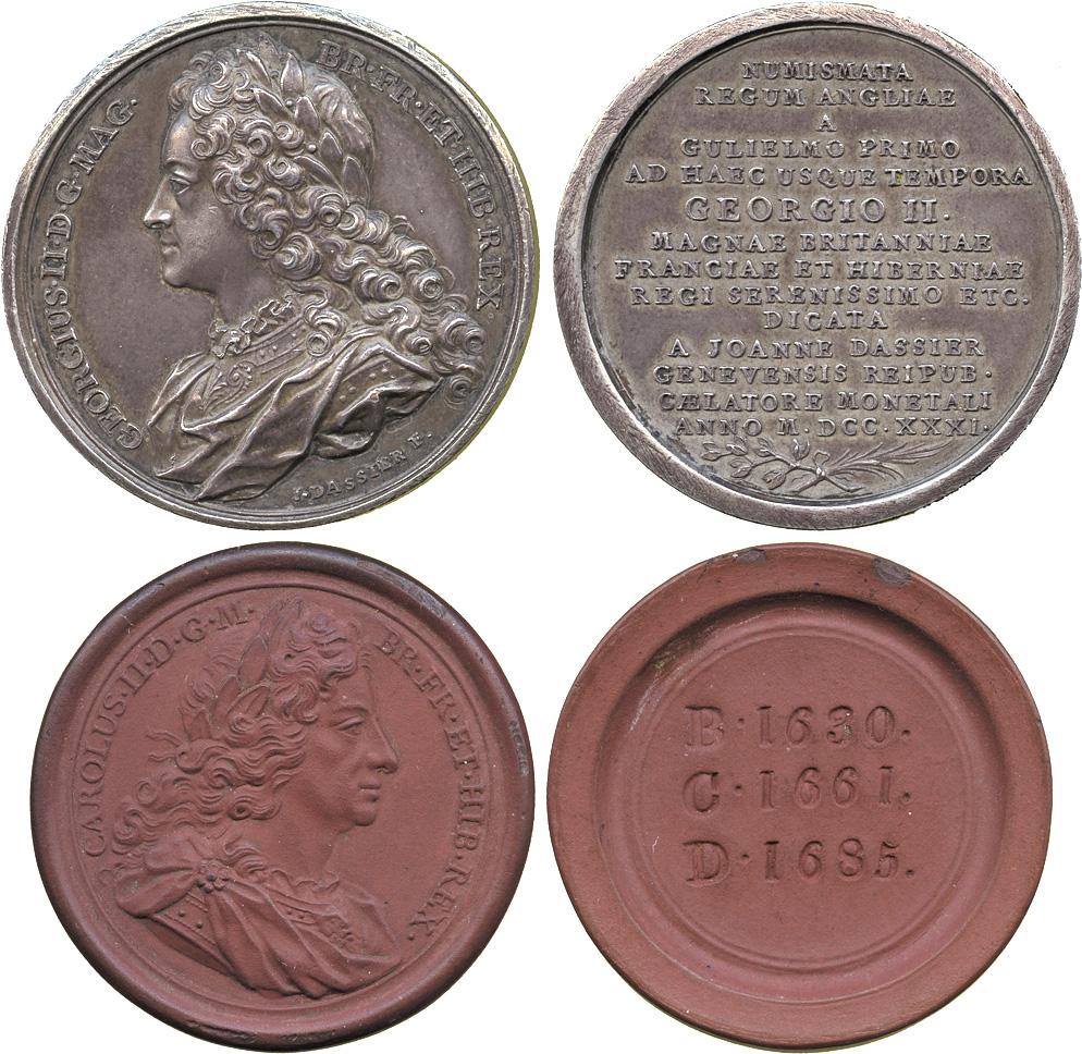 COMMEMORATIVE MEDALS. BRITISH HISTORICAL MEDALS. George II, Silvered-bronze Medal, 1731, by Jean Dassier, the Dedication Medal to the Series of British Monarchs, bust right, 41mm (MI 498/43), extremely fine; Charles II, Terracotta Medal, rev B 1630 / C 1661 / D 1685, 40mm, much as made. (2)