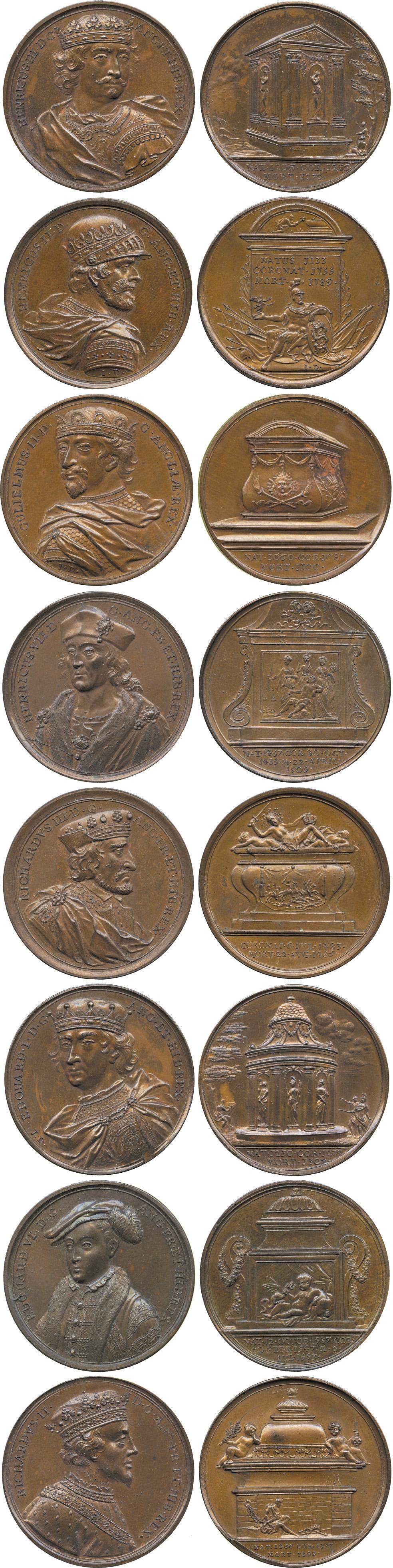 COMMEMORATIVE MEDALS. BRITISH HISTORICAL MEDALS. Kings of England, Copper Medals (8), from Dassier’s Series of British Monarchs, 1731, William II, Henry II, Henry III, Edward I, Richard II, Richard III, Henry VII, Edward VI. Extremely fine or virtually so. (8)
