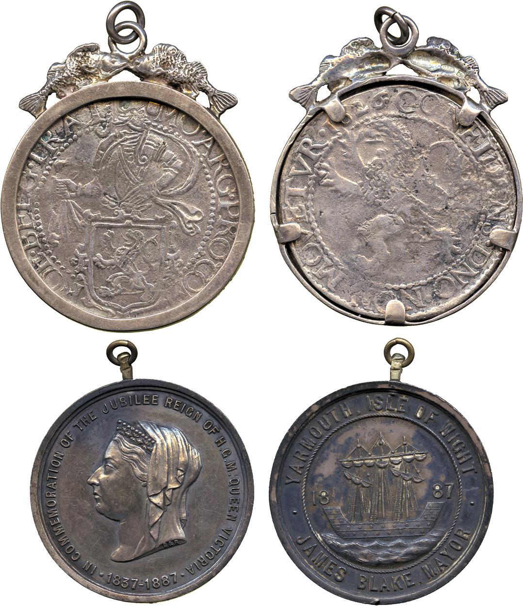 COMMEMORATIVE MEDALS. BRITISH HISTORICAL MEDALS. Victoria, Yarmouth, Isle of Wight, Jubilee 1887, Silver Medal, by Baddeley & Reynolds, head left, rev arms of Yarmouth, a medieval ship, JAMES BLAKE MAYOR, 39mm (BHM 3223, not recorded in silver), toned nearly extremely fine; and a sea-salvage Campen Daalder, 1627, in loose mount with fish suspender, edge inscribed “CAMPEN – ISLE OF WIGHT”, good fine. (2)