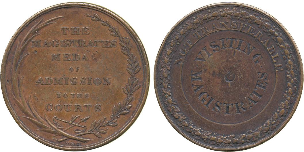 COMMEMORATIVE MEDALS. BRITISH HISTORICAL MEDALS. Yorkshire Assizes, Copper Magistrates’ Pass, c.1813, THE MAGISTRATES MEDAL OF ADMISSION TO THE COURTS, rev NOT TRANSFERABLE, and engraved, VISITING MAGISTRATE, 44mm (cf D&W 100/402). Very fine, rare.