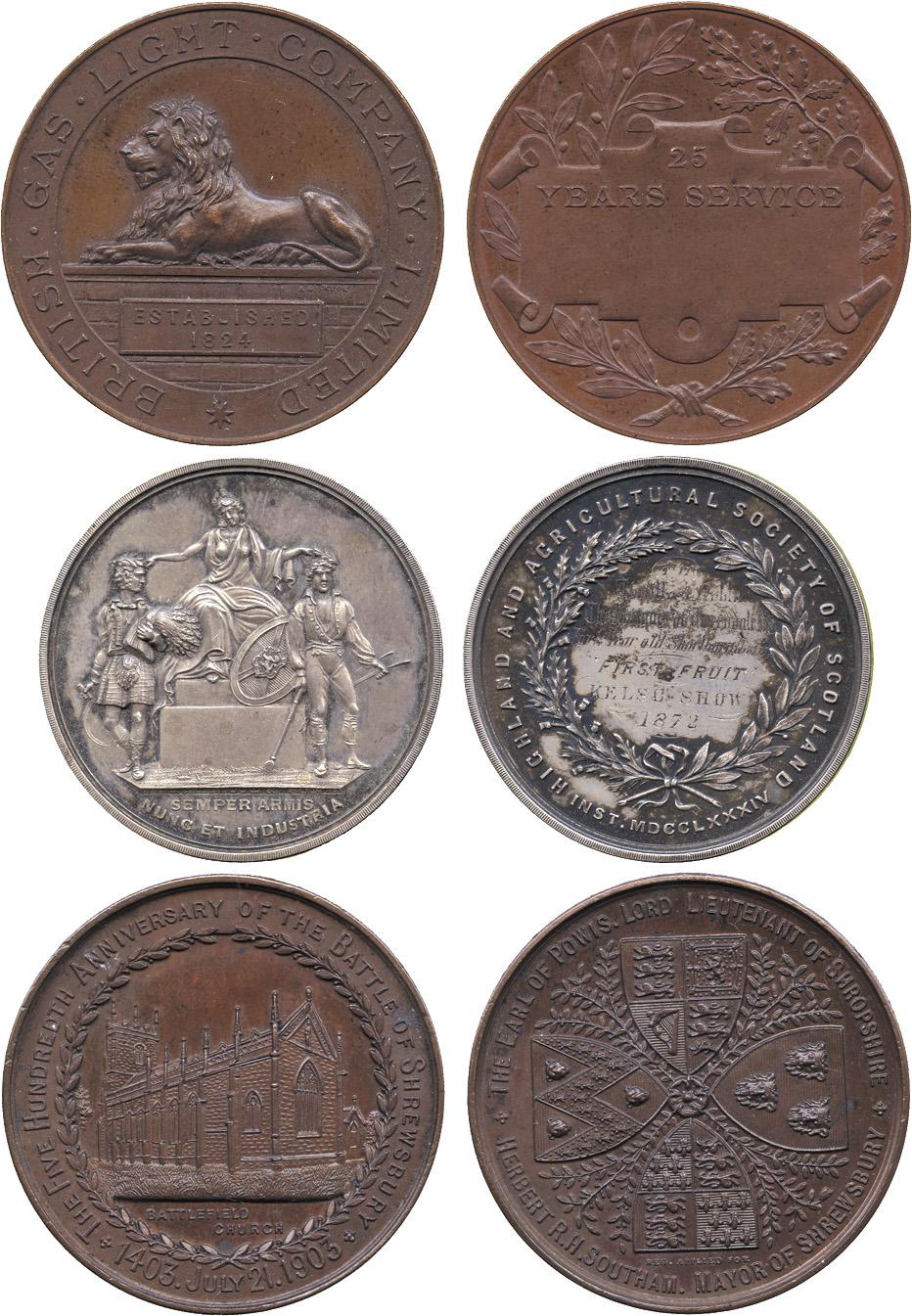 COMMEMORATIVE MEDALS BY THEME. Agriculture, Highland and Agricultural Society of Scotland, small Silver Prize Medal, 1872, “To The Most Noble The Marquis of Tweeddale for 2 Year Old Shorthorn Hefer ‘First Fruit’ Kelso Show”, 35mm; Battle of Shrewsbury, 1403-1903, Copper Medal, edge ‘Gift of the Mayor’, 38mm; British Gas Light Company, un-named 25 year Service Medal, Copper, 38mm. All extremely fine. (3)