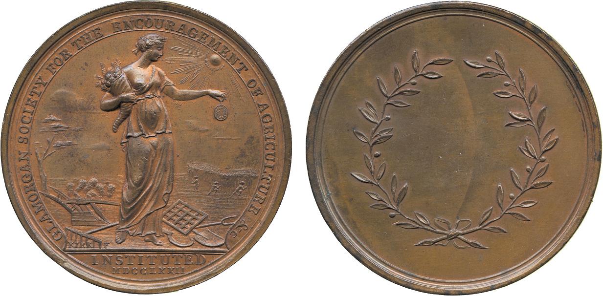 COMMEMORATIVE MEDALS BY THEME. Agriculture, Wales, The Glamorgan Society for the Encouragement of Agriculture, Instuted 1772, Copper Medal, by J Kirk, Flora stands in rural landscape with cornucopiae and holding medal, rev wreath and space for naming, 52mm. Extremely fine and some original colour.