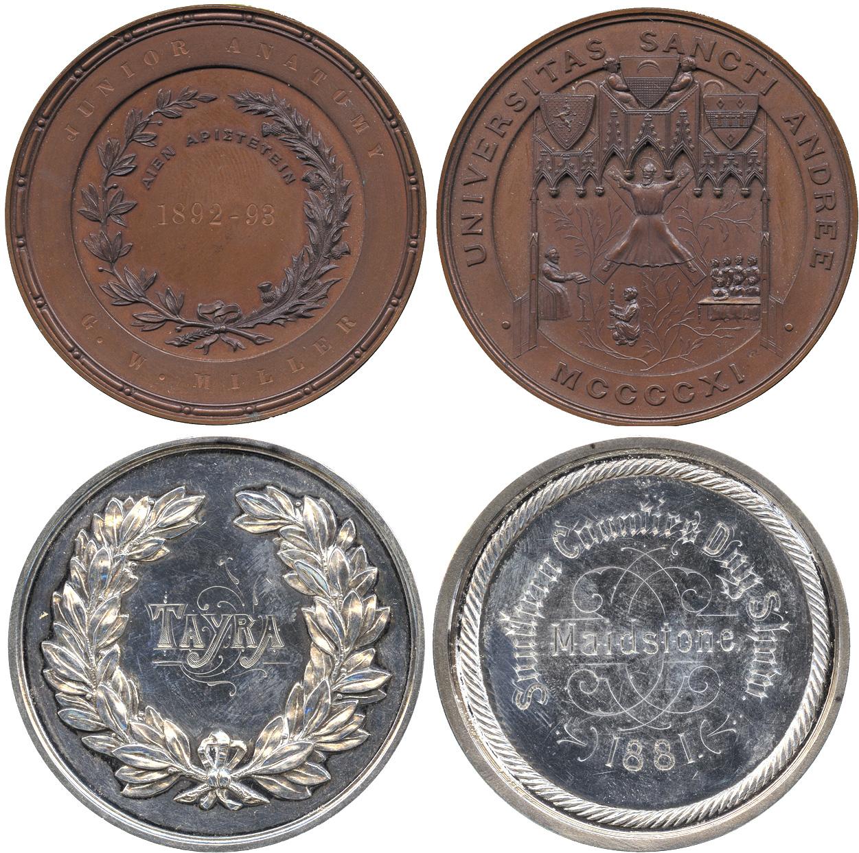 COMMEMORATIVE MEDALS BY THEME. Dogs, Southern Counties Dog Show, Maidstone, 1881, Silver Prize Medal, engraved inscriptions, awarded to “Tayra”, 51mm, in case; St Andrew’s University, Copper Prize Medal, 1892-1893, Junior Anatomy (G W Miller), 51mm, in case of issue. Extremely fine. (2)