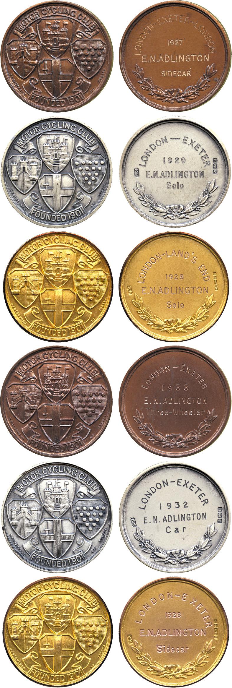 COMMEMORATIVE MEDALS BY THEME. Motor Cycling, a group of Motor Cycling Club Award Medals to E N Adlington, in (9ct) Gold (2), 1928, London – Land’s End, Solo, 1928, London – Exeter, Sidecar; Silver (2), 1929, 1932; Bronze (2), 1927, 1933, this for Three-Wheeler, all 32mm, total gold weight 33.70g, in cases of issue (Spencer & Co). Much as issued, mint state. (6)