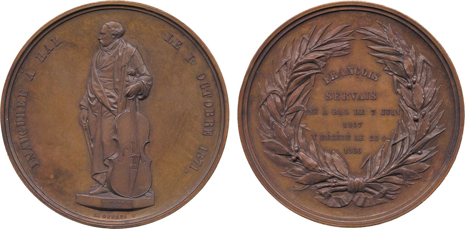 COMMEMORATIVE MEDALS BY THEME. Music, Adrien François Servais (1807-1866), Belgian cellist, the inauguration of his statue in Halle, Copper Medal, 1869, by Geerts, view of statue, rev legend in wreath, 65mm. Virtually mint state.