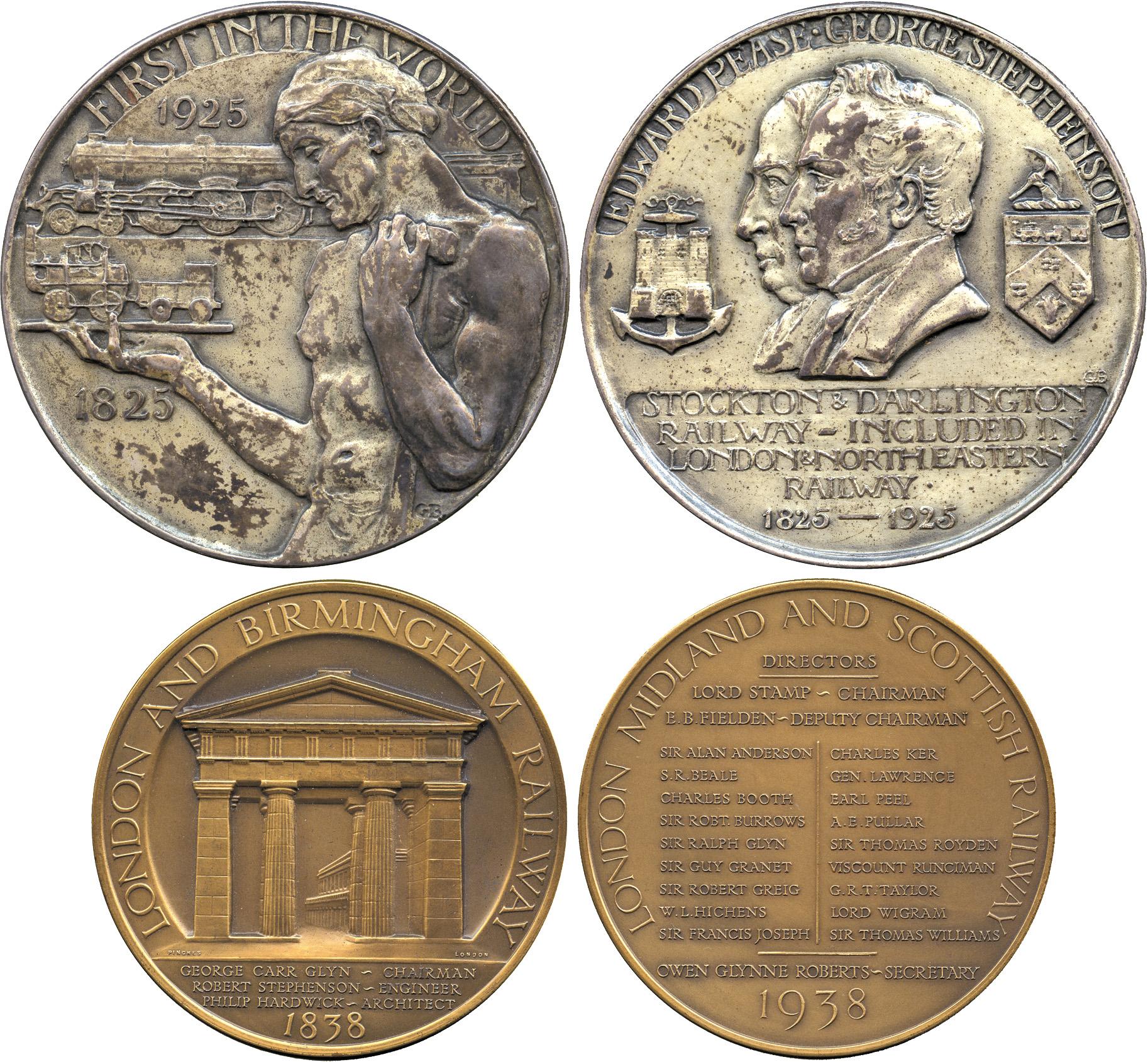 COMMEMORATIVE MEDALS BY THEME. Railways, Stockton to Darlington Railway, Centenary 1925, Silver Medal, by Gilbert Bayes, busts of Pease and Stephenson, rev Vulcan holds “Locomotive No 1”, 76mm (BHM 4205), mottled matt surface, nearly extremely fine; London & Birmingham Railway, Centenary 1938, Bronze Medal, by Pinches, Euston Arch, rev names of Directors, 64mm, in case of issue (BHM 4391), as struck. (2)