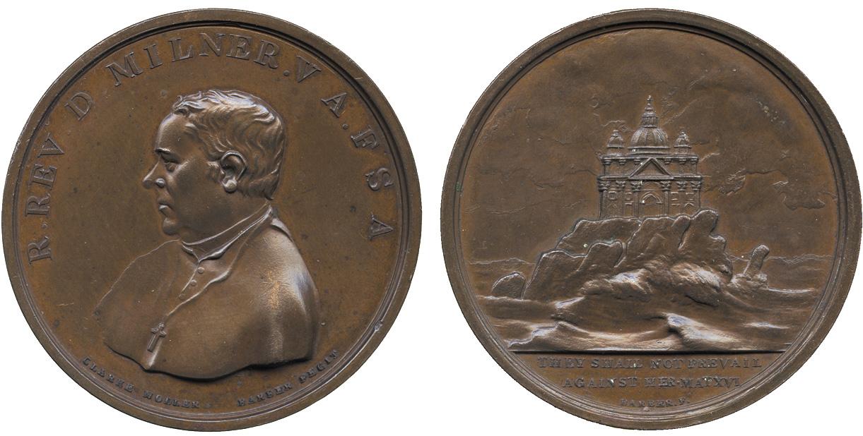 COMMEMORATIVE MEDALS BY THEME. Religion, Ireland, The Right Reverend D Milner, VA [Vicar Apostolic] FSA, Copper Medal, undated, by Clarke & Barber, bust left, rev church built on rock, in stormy seas, 51mm (BHM -). Good very fine.
