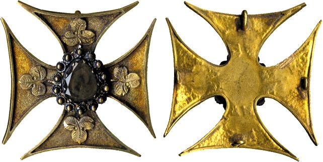 COMMEMORATIVE MEDALS. OTHER BRITISH MEDALS. IRELAND. Friendly Brothers of Saint Patrick, founded 1763, Gold Cross, a Maltese cross, shamrocks in each arm, the centre set with coloured stone, loops for suspension on each arm, 26mm, 19th Century piece. Very fine.
