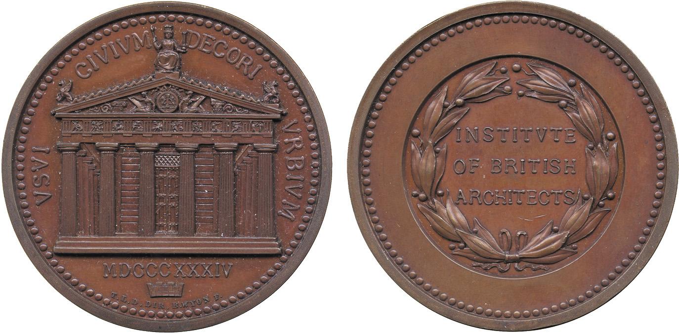 COMMEMORATIVE MEDALS. OTHER BRITISH MEDALS. Institute of British Architects, Specimen in Copper of the Silver Prize Medal, 1834, by Benjamin Wyon (with T L Donaldson), façade of a Doric Temple, rev institute named within wreath, 57mm (JT 24a). Mint state.