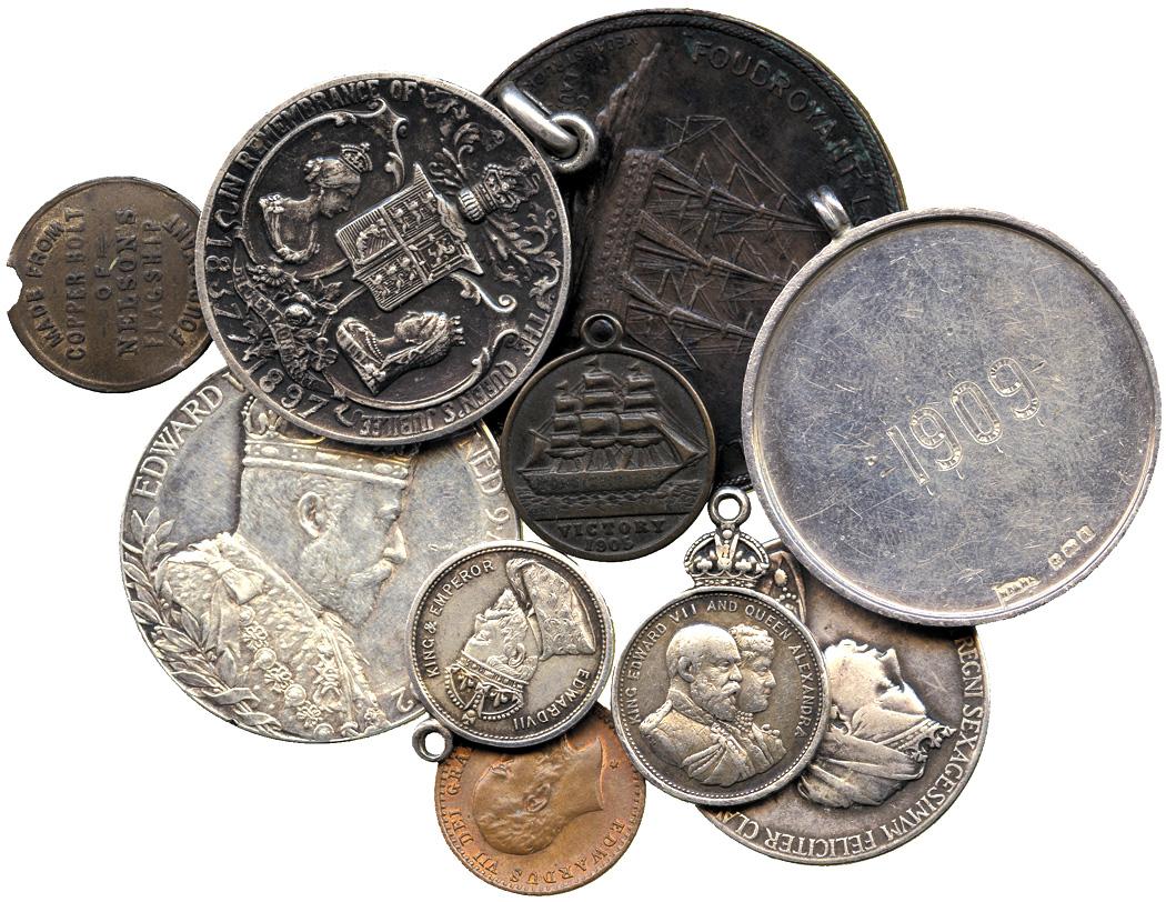 COMMEMORATIVE MEDALS. OTHER BRITISH MEDALS. MISCELLANEOUS. Medallions and Medalets (10), including Copper Medal of Viscount Horatio Nelson, 37mm, with associated medalets (2); Coronation of Victoria, Silver Medals and Medalets (5), Coronation of Edward VII, Bronze Medalet, 1908; Small Silver Medal, dated 1909, bearing hallmarks, Birmingham, 1908, 13.78g. The Nelson medal good very fine with a little verdigris, the others generally very fine. (10)