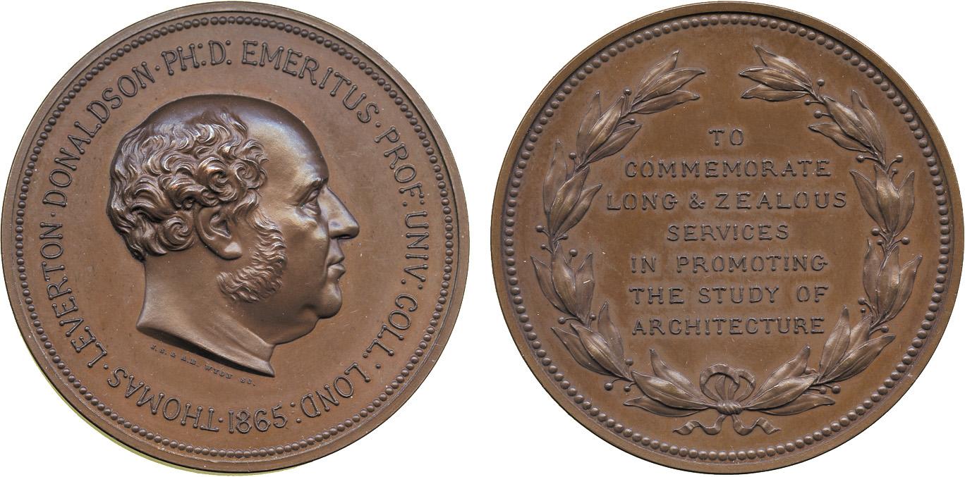 COMMEMORATIVE MEDALS. OTHER BRITISH MEDALS. Thomas Leverton Donaldson, Copper Medal, by JS & AB Wyon, head right, rev TO COMMEMORATE LONG & ZEALOUS SERVICES IN PROMOTING THE STUDY OF ARCHITECTURE, in open wreath, 57mm (BHM 2832). Extremely fine.
