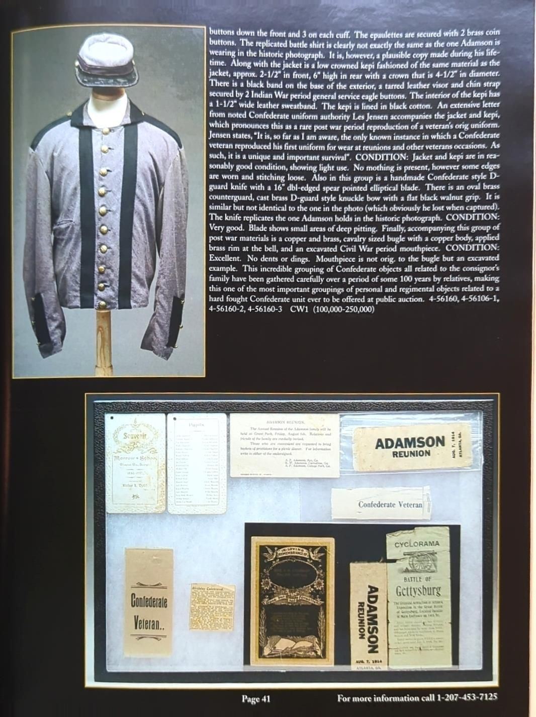 FLAG, COMPANY E 30TH GEORGIA VOLUNTEER INFANTRY. This flag was originally sold in large archive by James Julia Auctions, as lot 2071, October 4, 2005, of which a copy of that special catalog accompanies this flag. The documentation mentioned copied in original catalog description has been lost and only the transcription here support the history: "All a part of this amazing collection, were extensively examined by H. Michael Madaus, America's foremost authority on American and Confederate flags and his description of these marvelous flag follows: CONFEDERATE BATTLE FLAG, ATTRIBUTED TO THE 30TH GEORGIA INFANTRY. Adamson Collection. According to the letter of provenance from Mr. Adamson, the flag as well as the other relics were inherited directly from his aunt Faye Adamson E.E. C.I.K., his father's sister. Also in the trunk of relics was an old copy of a letter dated "December 2, 1865, Rex, Georgia. This flag belonged to The 30th Georgia Volunteer Infantry Company "E". It was made by the ladies of Clayton county and presented to the regiment by Miss Ella Callaway and accepted by Private J.H. Huie, April 18, 1862. this flag represented the 30th Georgia in the following battles: Jackson, Chickamauga, …A.P. Adamson, 1866." With letter of authenticity from Les Jensen. This flag was found (falling apart according to the family descendants) in the trunk of "relics" belonging to Corporal Augustus Pitt Adamson, Company E, 30th Georgia Infantry. Close examination of the reconstructed flag shows fragments of the original stitching which was believed to be silk and thus explains the deterioration of the stitching only. The Adamson descendants had the flag "reassembled" by a conservator in the late 20th century using deliberately large stitches and synthetic thread to distinguish any modern re-stitching from stitching that remained contemporaneous to the Civil War. This flag was produced by a "home" sewing group (as opposed to being spec-made at a government clothing depot), very possibly by first disassembling an older, large U.S. flag for its components. The flag itself conforms to the general design of the Army of Northern Virginia battle flag, but measures 54-1/2" on its staff by 57" on its fly overall. The red, wool, bunting field is pieced in each quadrant.. The outside sections measure between 4-1/2" and 6" in width and the inner triangles having a height between 8-1/4" and 9-1/2". A dark blue, wool, bunting St. Andrew's cross is inset into the field, 8" to 8-1/2" wide, and pieced from rectangles of bunting 8-1/2" to 9" long (with each end piece about 16" so as to extend fully to the corners). The cross is bordered on each side with a strip of white, wool bunting, 2" to 2-1/8" wide. Each of the thirteen sections of the cross bears a white, cotton, 5-pointed star averaging 8" across their points on the obverse and 7" across their points on the reverse. These stars are sewn to the obverse side with a running stitch with white (yellowed with age) thread. The dark blue bunting behind each star was then cut away and under-hemmed and secured with a whipstitch of a different (black aged brown) thread (a technique for lightening the flags not uncommon during the Civil War and earlier). A 4" wide, white, wool, bunting border (formed by doubling over an 8-1/2" wide piece of bunting) was then added to all four sides. An additional pc of linen canvas, 2-1/2" wide, was then folded and doubled over the leading edge of the flag to serve as a 1-1/4" diameter sleeve for a cord that protrudes into loops at two cuts along the staff edge and at each end of the flag's heading, which secured the flag to its staff." UNATTACHED ACCESSORIES: Oct. 4, 2005 James D Julia Auction Catalog, "The Collection of Michael Adamson". CONDITION: flag is in overall good condition, although, as noted, all but the stars have been extensively re-stitched with a heavy synthetic dyed thread to replace what was the original (probably silk) and now missing, construction thread. Aside from these distractions, one of the quadrants shows minor separation of the bunting fabric and two of the stars are holed – one with a small hole – the other with a major deterioration due to a contact with some acidic liquid, possibly blood. (Note, the 30th Georgia Infantry reportedly lost a flag at Nashville, Tennessee on 16 December 1864, which was torn into pieces by the capturing unit (the 5th Minnesota Infantry). However, that flag is not the same flag as described here). (02-18125'/JS). NON-GUN. $4,000-8,000.