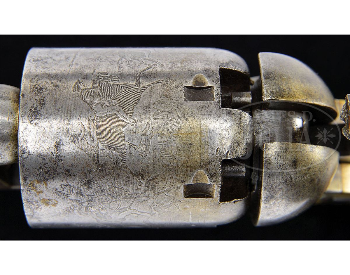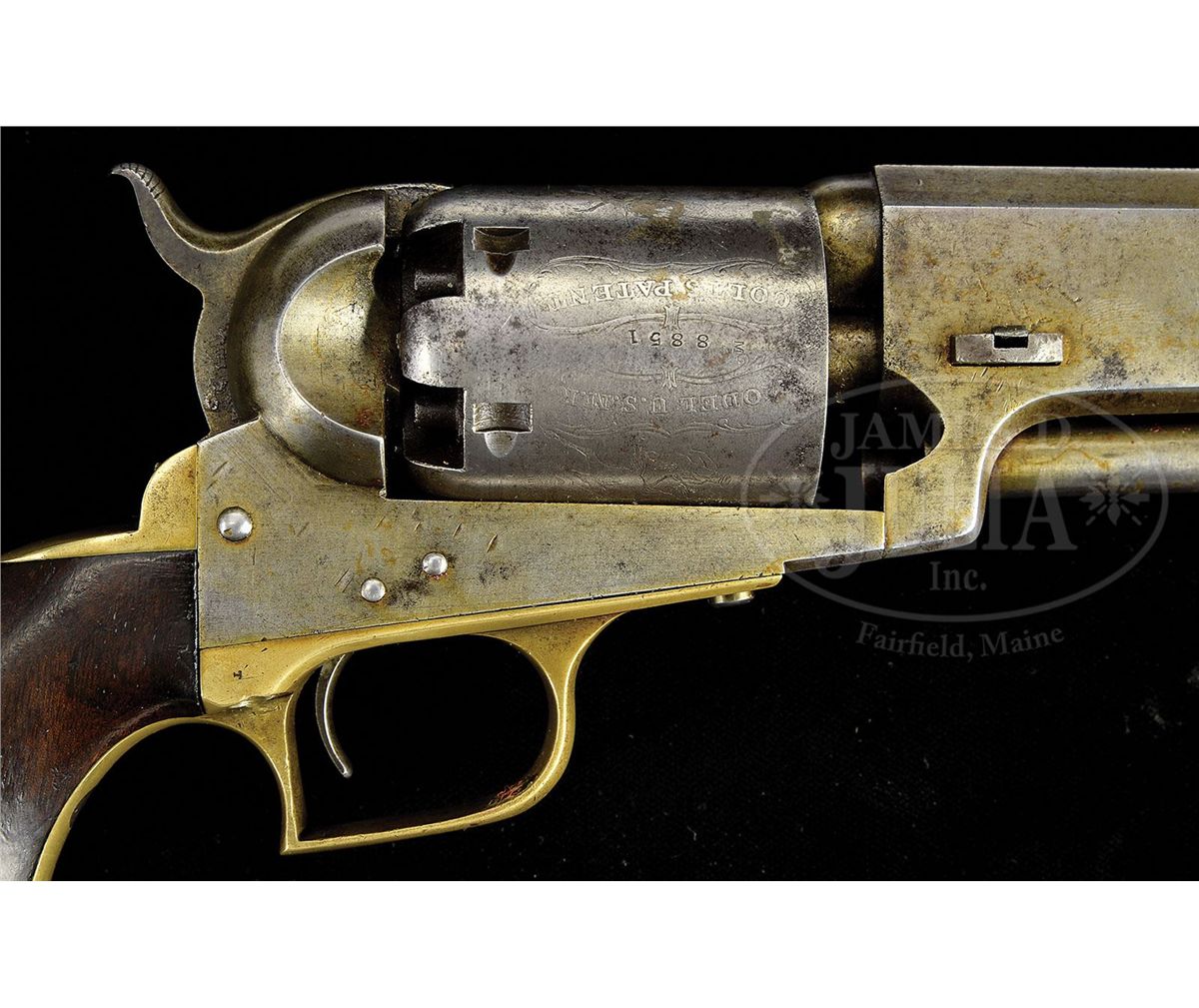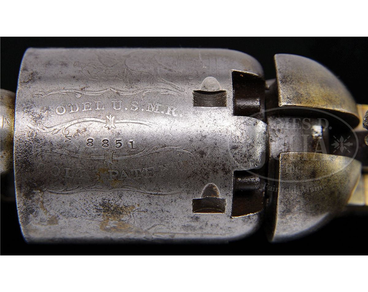 PLEASE NOTE (10/7/13): Tiny piece of wood missing at tip of left toe of the butt. SN 8851. Cal. 44. Usual configuration with 7-1/2" oct to rnd bbl, German silver front sight and 1-line New York City address. Left side of frame has a small "COLT'S PATENT" over a tiny "U.S.". The squareback brass trigger guard & backstrap contain a very nicely figured 1-pc walnut grip with matching SN in backstrap channel. Cyl is usual 6-shots with Dragoon/Indian fight scene roll marking and "MODEL U.S.M.R. / COLT'S PATENT" panels on each side of the SN. Cylinder has three partially serviceable safety pins. Although the frame is "U.S." marked and various parts have small inspector initials, the grip is without cartouches and it appears that this was a commercial Dragoon assembled from contract overrun parts. The 2nd Model Dragoon was produced only during 1850-1851 with only about 2,700 manufactured in that period. Of that small number 1,000 were on contract to the government. Colt, anticipating larger orders, produced parts to make the additional 1,700 revolvers, most of which were inspected at the plant but when the contracts from the government did not materialize he simply had them assembled into revolvers and sold them on the commercial market. Regardless of where they were sold these revolvers saw hard frontier service which continued through the Civil War and remained in service well into the 1870s. This most rare of Dragoons is rarely found today with any orig finish with most having seen very hard use. CONDITION: Very good, all matching except wedge which is numbered "9216". All the steel parts retain a cleaned gray metal patina with scattered discoloration and some very fine pitting on right side of bbl; cyl is matching patina with scattered spots of fine pitting and shows 75-80% Dragoon/Indian fight scene with crisp clear panels; grip frame is a cleaned medium mustard patina. Grip shows moderate wear with a handworn patina. Mechanics are fine, strong bright bore with a few small spots of pitting. 4-48805 JR376