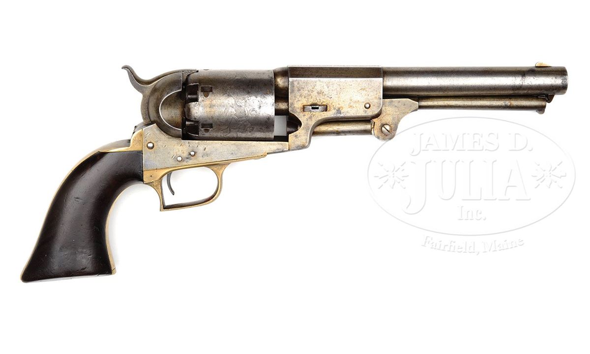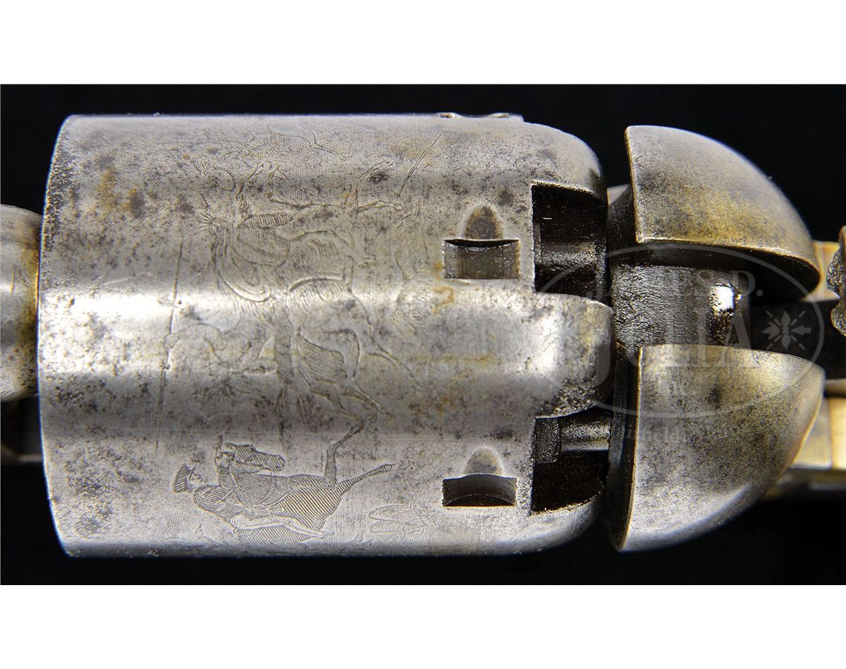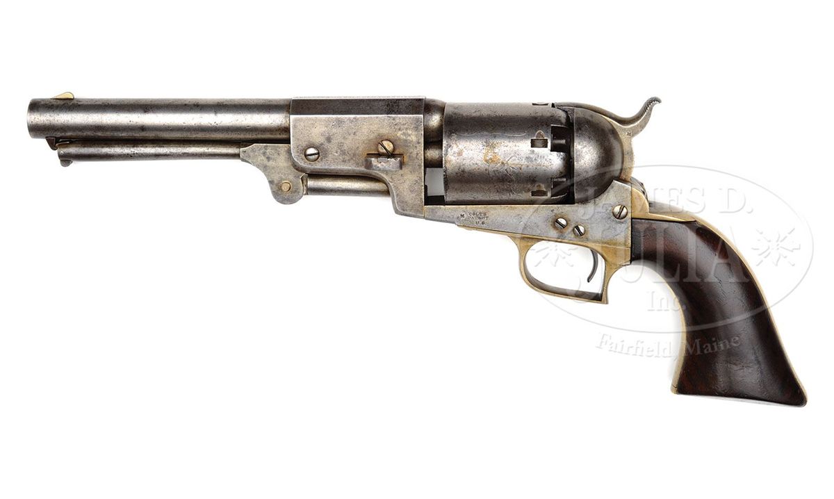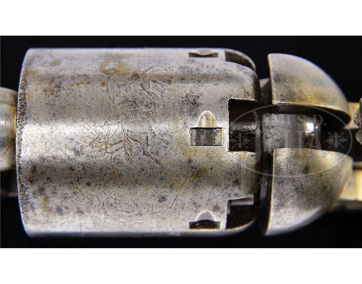 PLEASE NOTE (10/7/13): Tiny piece of wood missing at tip of left toe of the butt. SN 8851. Cal. 44. Usual configuration with 7-1/2" oct to rnd bbl, German silver front sight and 1-line New York City address. Left side of frame has a small "COLT'S PATENT" over a tiny "U.S.". The squareback brass trigger guard & backstrap contain a very nicely figured 1-pc walnut grip with matching SN in backstrap channel. Cyl is usual 6-shots with Dragoon/Indian fight scene roll marking and "MODEL U.S.M.R. / COLT'S PATENT" panels on each side of the SN. Cylinder has three partially serviceable safety pins. Although the frame is "U.S." marked and various parts have small inspector initials, the grip is without cartouches and it appears that this was a commercial Dragoon assembled from contract overrun parts. The 2nd Model Dragoon was produced only during 1850-1851 with only about 2,700 manufactured in that period. Of that small number 1,000 were on contract to the government. Colt, anticipating larger orders, produced parts to make the additional 1,700 revolvers, most of which were inspected at the plant but when the contracts from the government did not materialize he simply had them assembled into revolvers and sold them on the commercial market. Regardless of where they were sold these revolvers saw hard frontier service which continued through the Civil War and remained in service well into the 1870s. This most rare of Dragoons is rarely found today with any orig finish with most having seen very hard use. CONDITION: Very good, all matching except wedge which is numbered "9216". All the steel parts retain a cleaned gray metal patina with scattered discoloration and some very fine pitting on right side of bbl; cyl is matching patina with scattered spots of fine pitting and shows 75-80% Dragoon/Indian fight scene with crisp clear panels; grip frame is a cleaned medium mustard patina. Grip shows moderate wear with a handworn patina. Mechanics are fine, strong bright bore with a few small spots of pitting. 4-48805 JR376