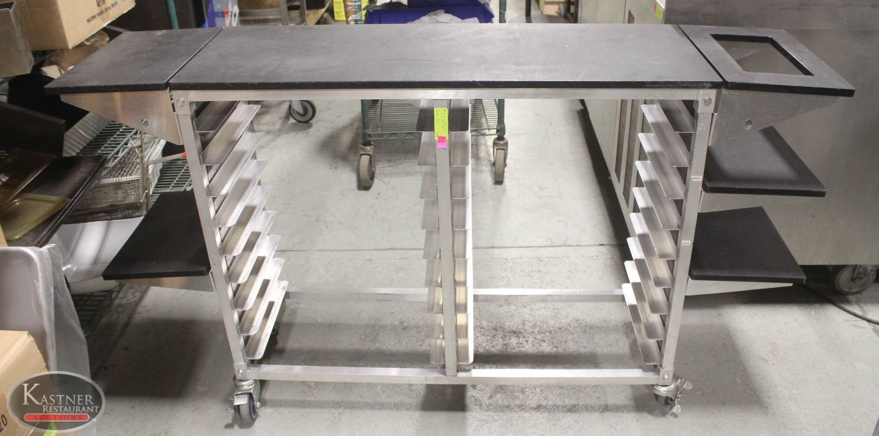 W/ FIVE SHELF EXTENSIONS, INTEGRATED 1/2-SIZE BUN PAN RACKS(HOLDS 18) ON CASTORS, 60" X 14" X 34" (W/ EXTENSIONS).