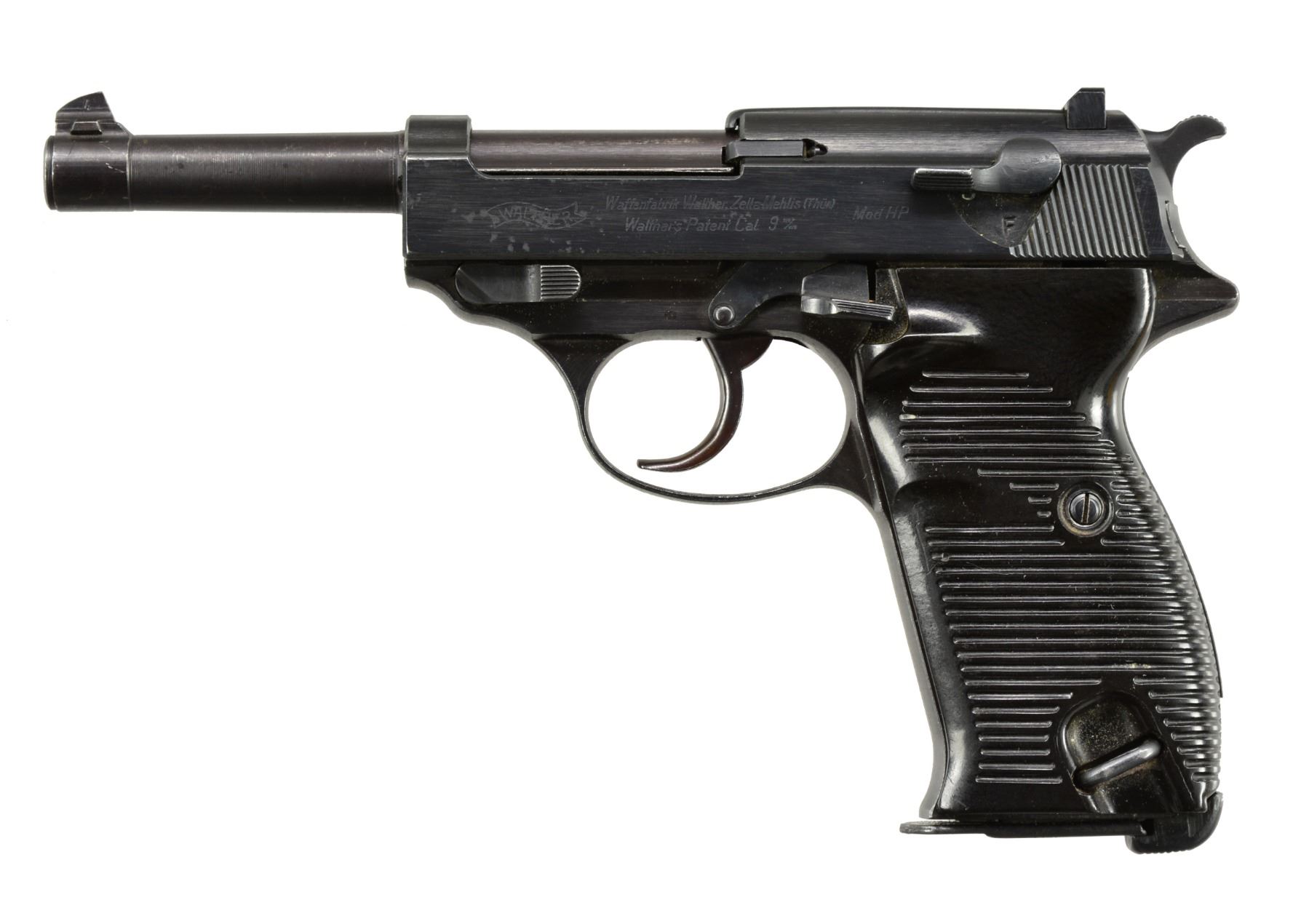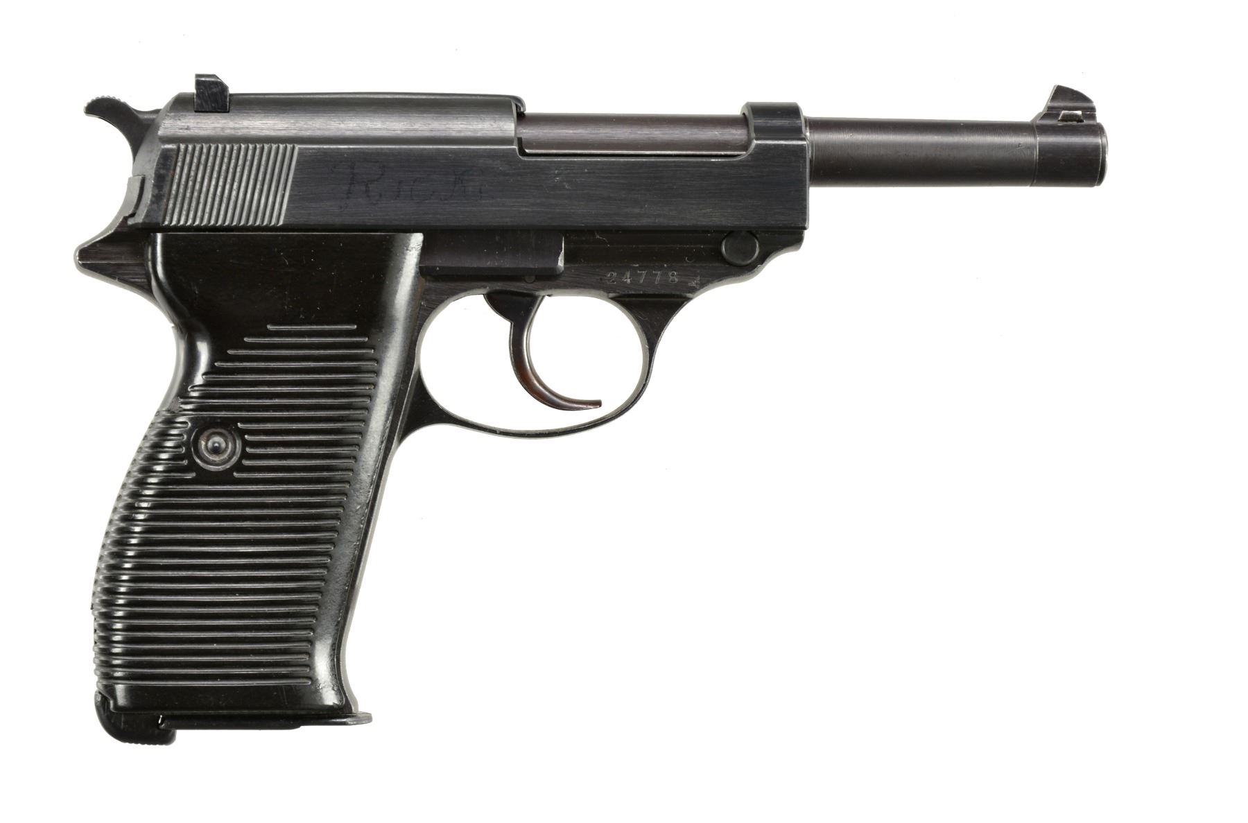 Cal. 9 mm. S# 24778. Bbl. 5". Matching numbered bbl. & frame. Eagle N bbl. & frame. Unnumbered slide w/ standard Walther Banner two line slide markings. Evidence of electro penciled name on right side of slide. Bakelite grips. MAGS: 1 - 8 rd. "p.38v/U". CONDITION: overall very good reblued metal finish w/ mild handling marks & high edge wear. Scattered fine oxidation spots present. Very good bright bore w/ sharp rifling. (19-5142/ZAL). CURIO. $800 " 1,200.