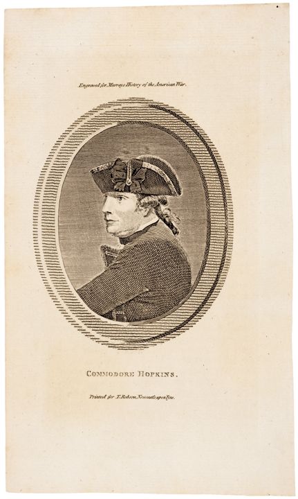 An original and rare handsome copperplate engraving of the important Revolutionary War American naval hero COMMODORE ESEK HOPKINS, first Commander of the Continental Navy. This print was removed from Murray's "History of the War in America" published in 1782. Overall size 5" x 8" on handmade period paper, blank reverse. Esek Hopkins (1718-1802) of Rhode Island was a well known Privateer of the French and Indian War. He was appointed Commodore and first Commander of the fledgling Continental Navy during the American Revolution. This portrait was prepared for one of the first British narratives about the American Revolution, published before the end of the war. A great print impression for display.