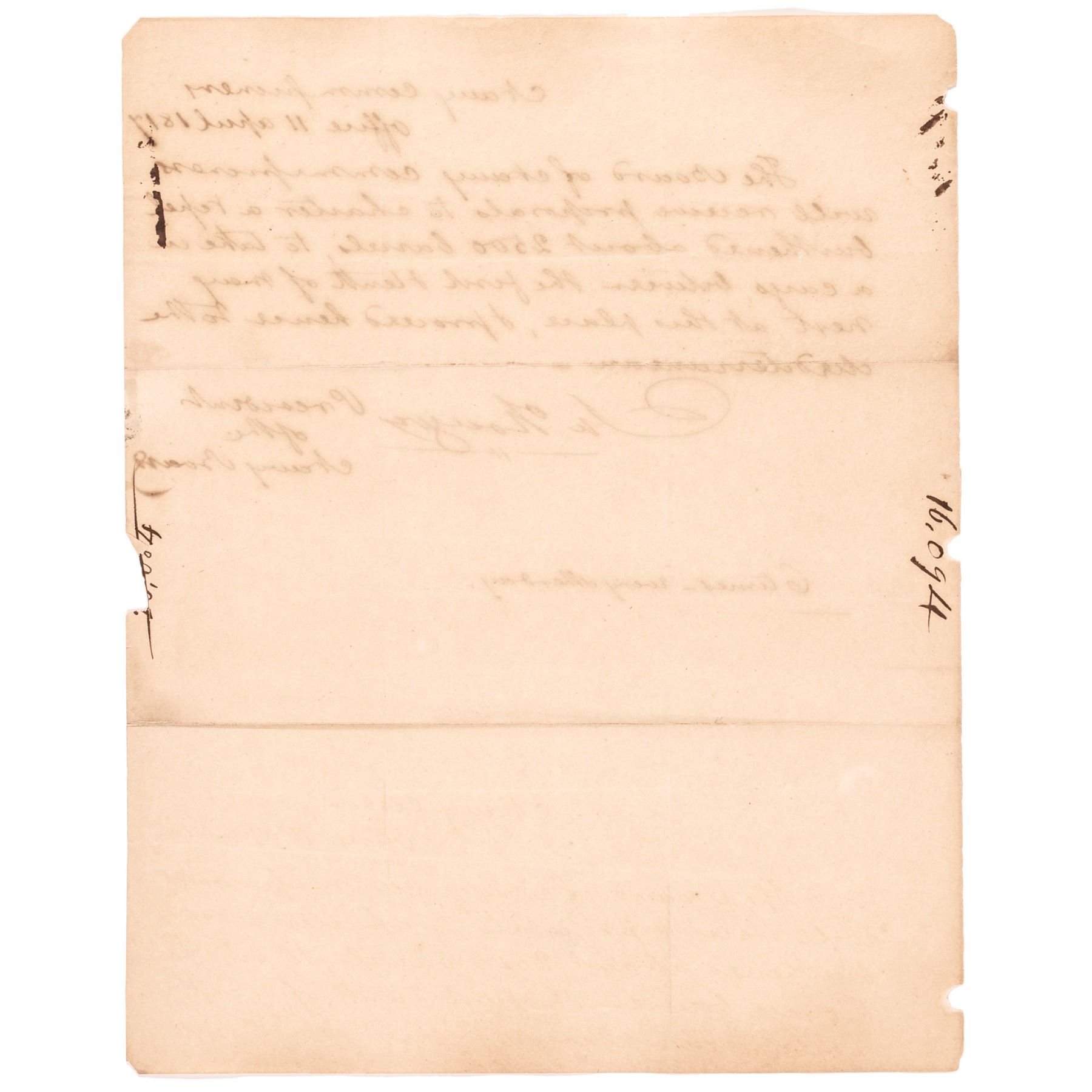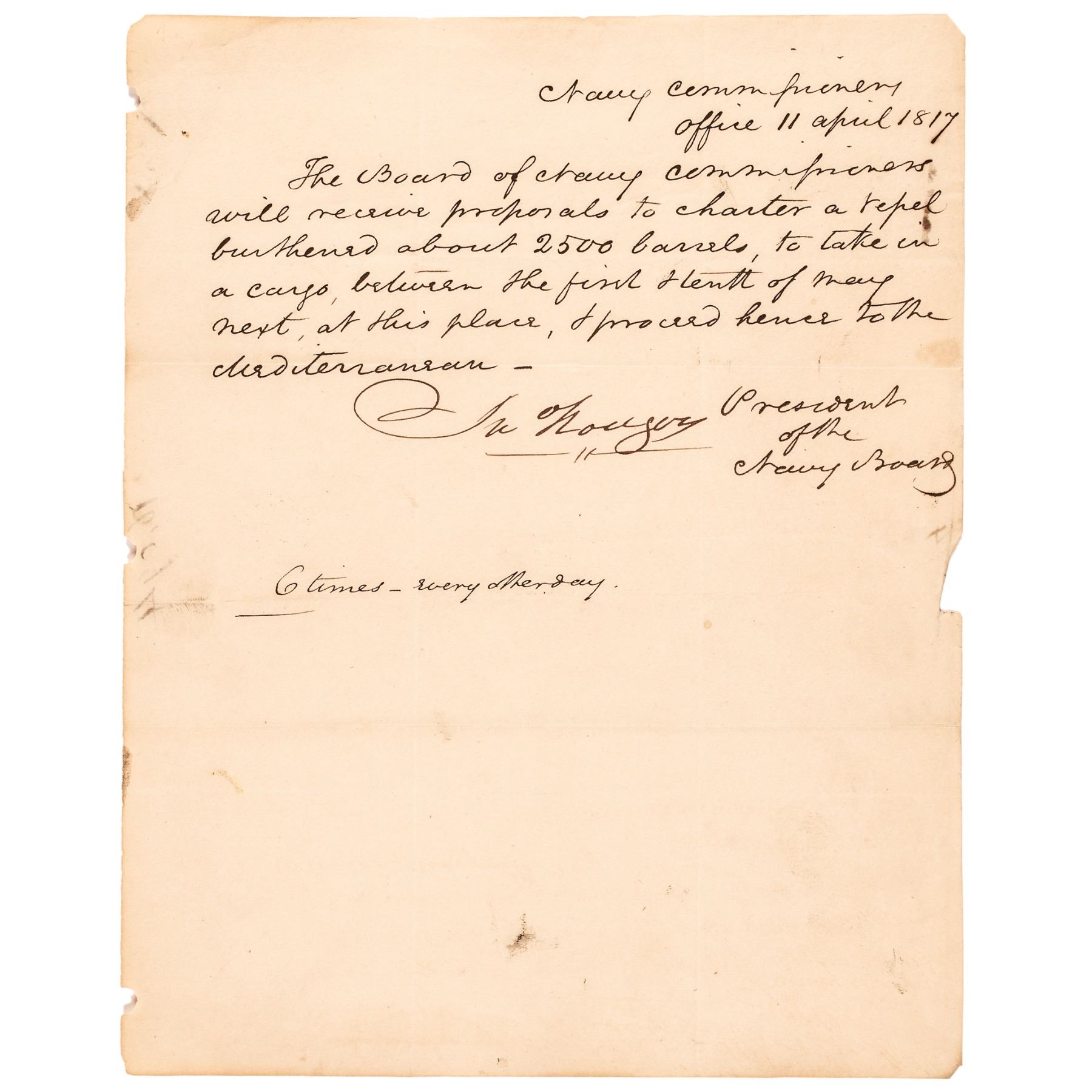 April 11, 1817-Dated, Autographed Manuscript Document Signed, “Jn Rodgers” as President of the United States Navy Board, measuring 8” x 10”, 1 page, Navy Commissioners Office (Washington), Fine. Light to moderate toning, normal folds, edge chip at center right edge, and with three chips on the left edge, most likely from an old binding. This Letter reads, in full: “The Board of Navy Commissioners will receive proposals to charter a vessel burthened about 2500 barrels, to take in a cargo between the first & tenth of May next, at this place, & proceed hence to the Mediterranean”. John Rodgers’ handsome clear signature is bold, and measures fully 3.25” across.