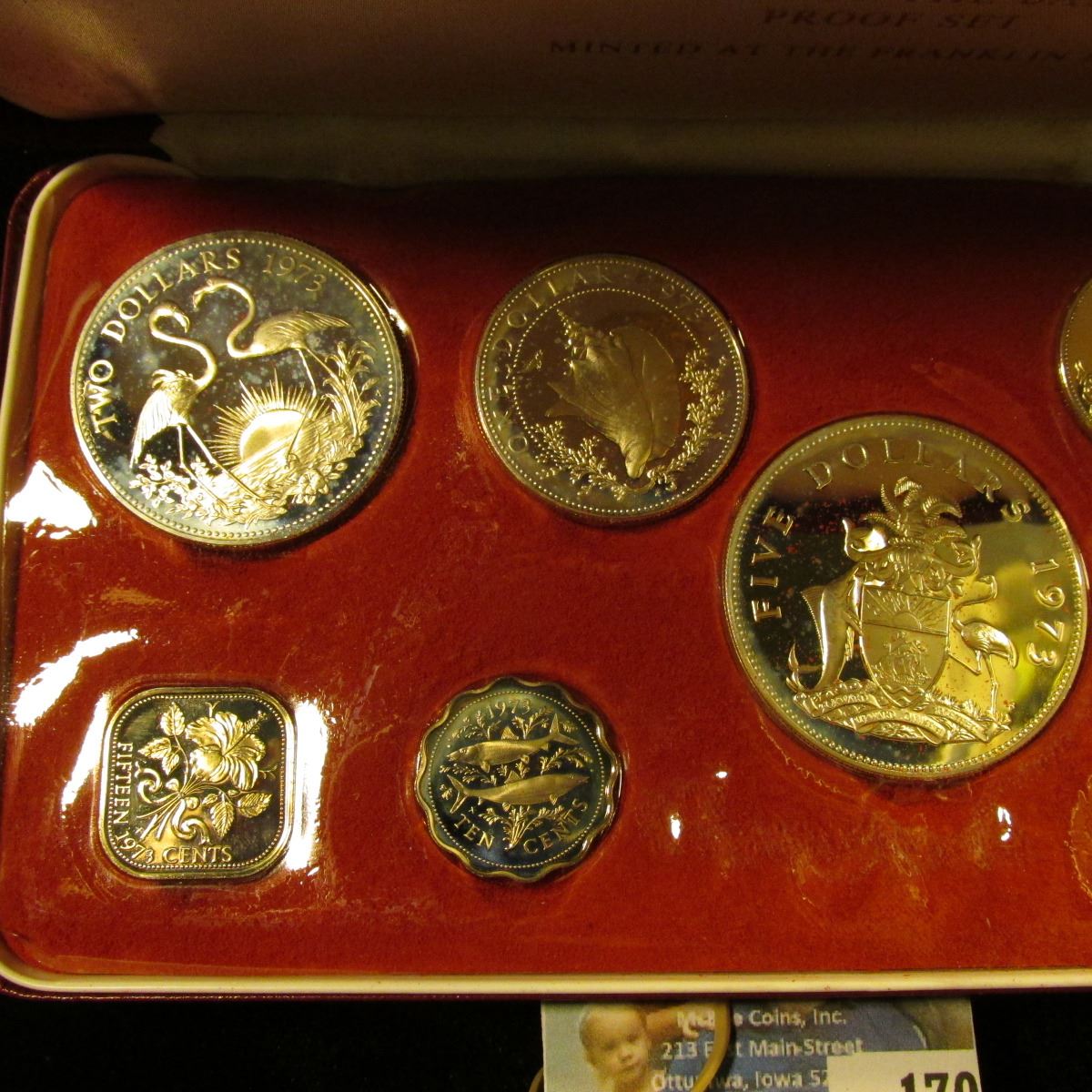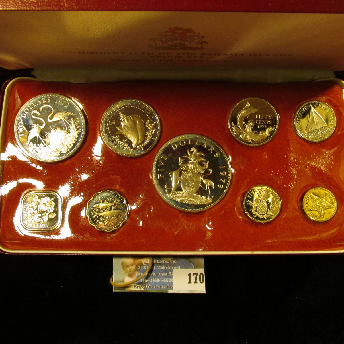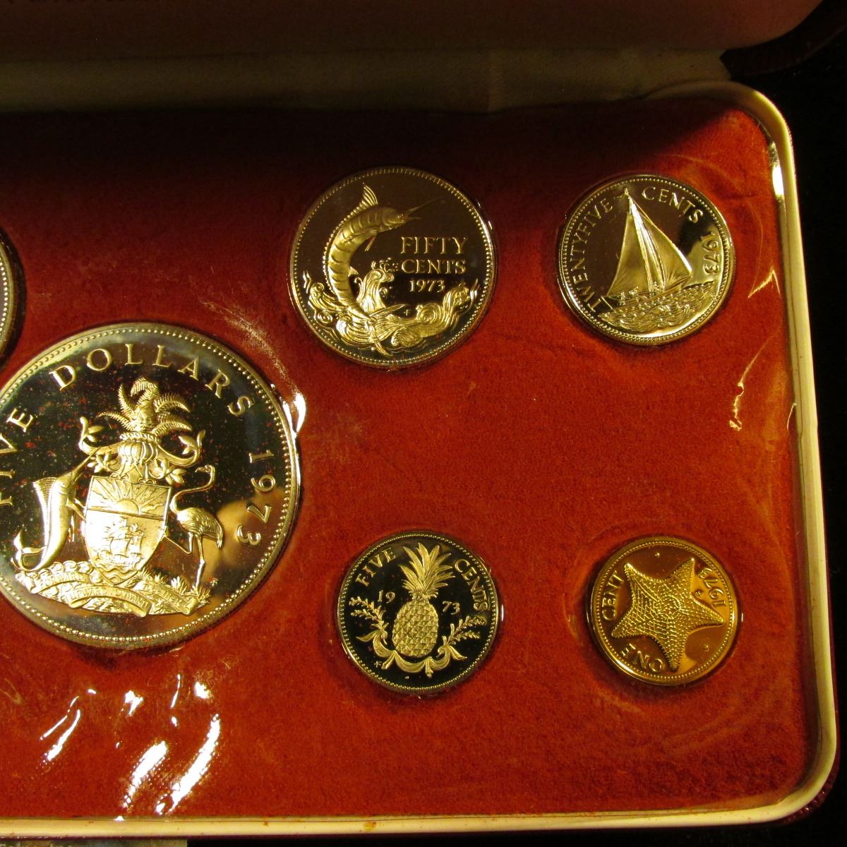 COMMONWEALTH OF THE BAHAMAS 1973 SILVER PROOF SET. THE SET INCLUDES A STERLING SILVER FIVE DOLLAR COI, STERLING SILVER TWO DOLLAR COIN, SILVER ONE DOLLAR, SILVER HALF DOLLAR,SILVER QUARTER, PLUS CLAD PENNY, NICKEL, DIME, AND QUARTER.