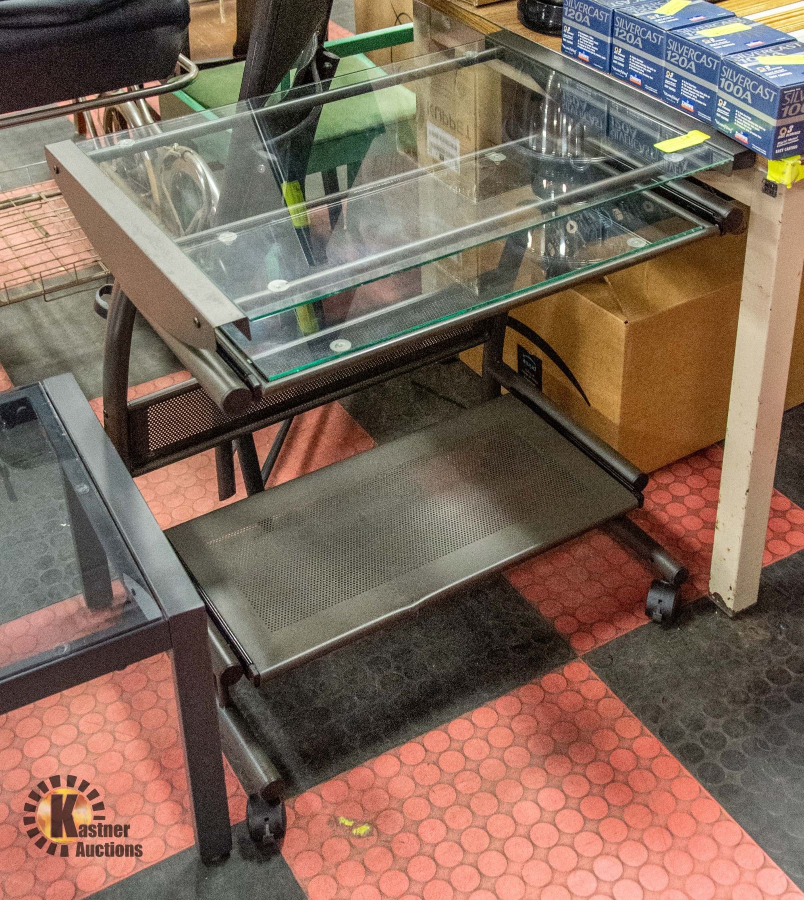 WITH GLASS TOP AND GLASS TOP ROLLOUT KEYBOARD DRAWER, BOTTOM ROLLOUT SERVICE DRAWER, LOCKING FRONT 4-WHEEL SWIVEL CASTORS (26"L X 19"W X 29.5"H) **ALL ITEMS MUST BE REMOVED BY 5PM SATURDAY, MAY 20TH 2023. ALL REMAINING ITEMS WILL BE SUBJECT TO A $6.00 PER DAY STORAGE CHARGE. ANY ITEMS REMAINING AFTER MONDAY, JUNE 5TH, 2023 WILL BE CONSIDERED FORFEITED. NO REFUNDS WILL BE ISSUED FOR FORFEITED ITEMS. TO SCHEDULE A PICK UP APPOINTMENT CLICK HERE