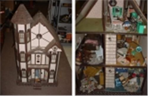 COMPLETE DOLL HOUSE FULLY FURNISHED INCLUDING MINIATURES, ACCESSORIES, AND DECORATED ROOMS.