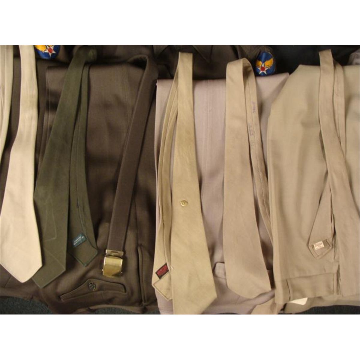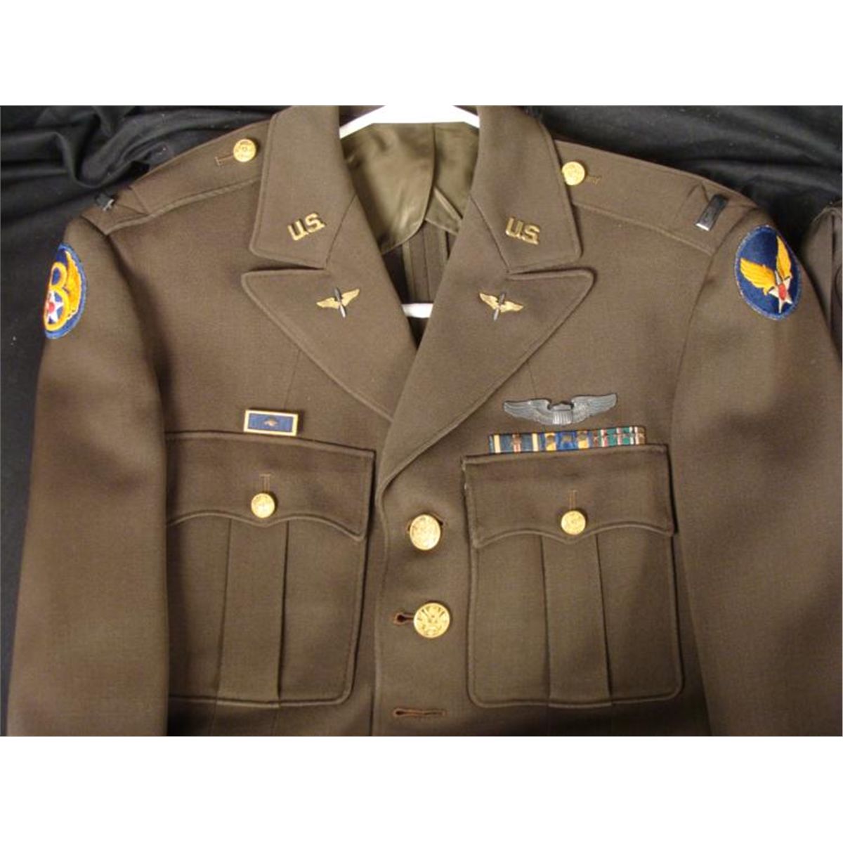 COMPLETE WWII U.S. 8TH AIR FORCE UNIFORM LOT-COMPLETE WITH WINGS- RIBBON BARS-PATCHES, ETC * OUTSTANDING US WWII 8TH AIR FORCE LIEUTENANT OFFICER'S FULL UNIFORM GROUPING--INCLUDES TUNIC--VERY HIGH QUALITY OFFICER'S REGULATION-WITH HIS PILOTS WINGS (AMICO-STERLING) -RIBBON BAR WITH 3 RIBBONS ONE WITH 1 OAK LEAF CLUSTER SECOND WITH 3 CLUSTERS AND THE THIRD WITH 6 GOLD STARS. ON OTHER SIDE :DISTINGUISHED UNIT CITATION BAR.- SLEEVES 8TH AF PATCH AND AAF PATCH-LAPELS AF WINGS AND US INSIGNIA--SHOULDERS HAVE SILVER 1ST LIEUT BARS--(1 COAT BUTTON NEEDS RE-SEWING) OTHERWISE FANTASTIC CONDITION--MATCHING PANTS-3 TIES-3 SHIRTS-DARK SHIRT HAS AAF & 8TH AF PATCHES-VERY HARD TO FIND DIRECT FROM VET UNIFORM GROUPINGS-USUALLY STRIPPED DOWN-GREAT EXAMPLE-TUNIC SIZE 37 LONG--PANTS 31 WAIST *