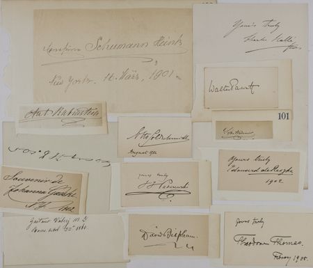 A lot of 13 signatures of acclaimed nineteenth and early twentieth-century musicians, most on small cards and mounted, includes: IGNACE J. PADEREWSKI, ANTON RUBINSTEIN, EDWARD DE RESKE, GAETONO VALERY, OTTO GOLDSCHMIDT, WALTER PARRATT, DAVID BISPHAM, THEODORE THOMAS, JOHANNA GADSKI, SEPTIMUS WINNER, SARAFINA SCHUMANN HEINZ and CHARLES HALLE. Along with actor JOSEPH JEFFERSON. Very good condition.