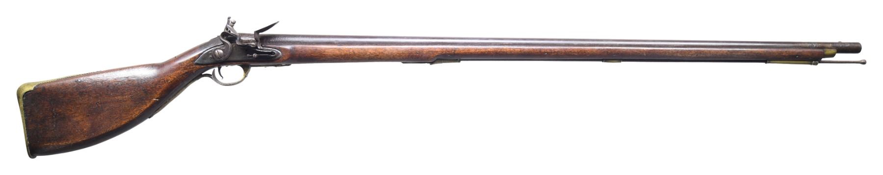 Cal. 78. NSN. Bbl. 45 1/4", sourced from a 1st Model Brown Bess stamped "38" at breech end & has sighting groove filed in. Flintlock is a mixture of old parts & new lockplate. Relatively new swan neck stock extends to w/in 2" of muzzle and is brass mounted with 1st Model Brown Bess furniture. CONDITION: bbl with dark brown patina reconverted. Lock aged. Wood with refinish and scattered marks. Some cracks around rear lock screw. Lock works. Bore pitted. PROVENANCE: formerly of the estate collection of Gary Parietti. (01-26497/DS). ANTIQUE. $700-1,000.