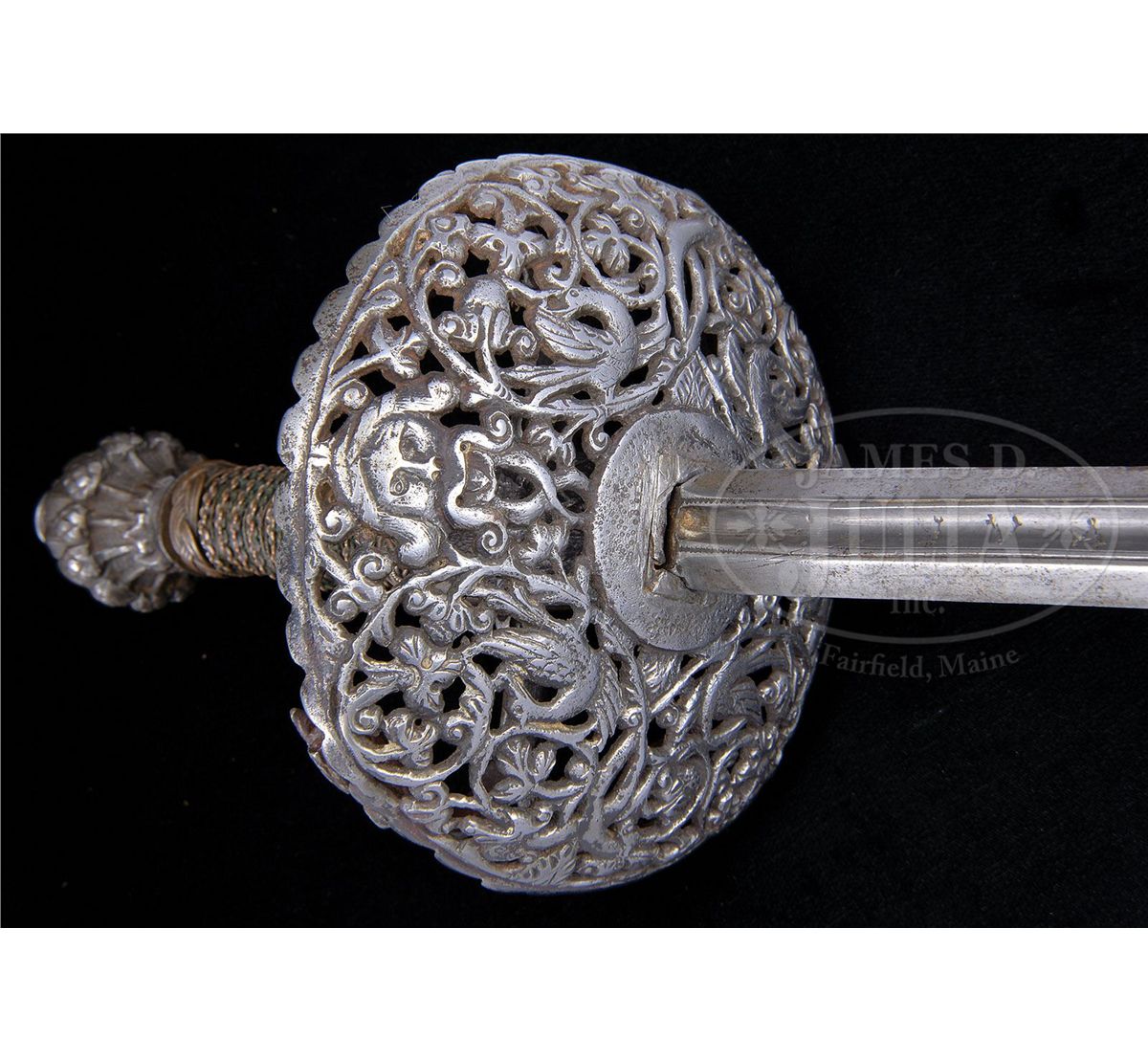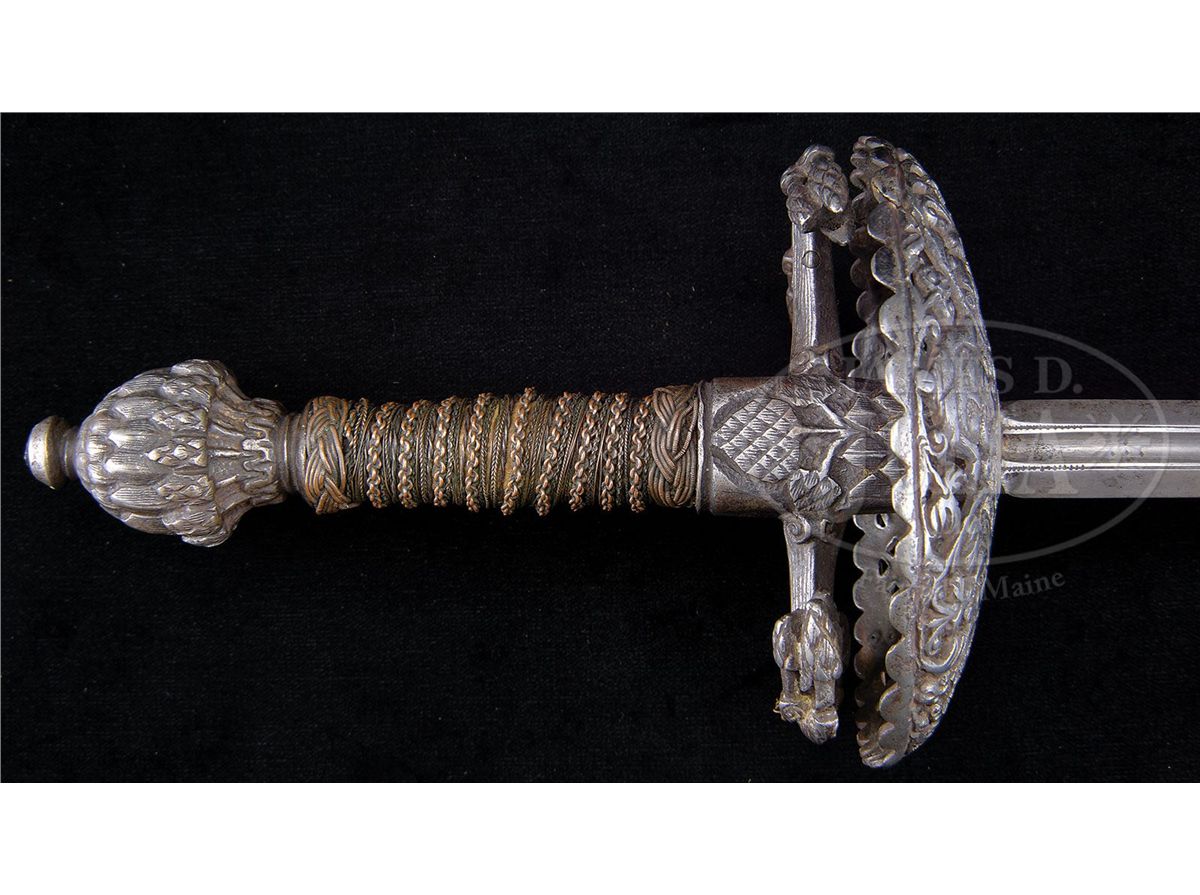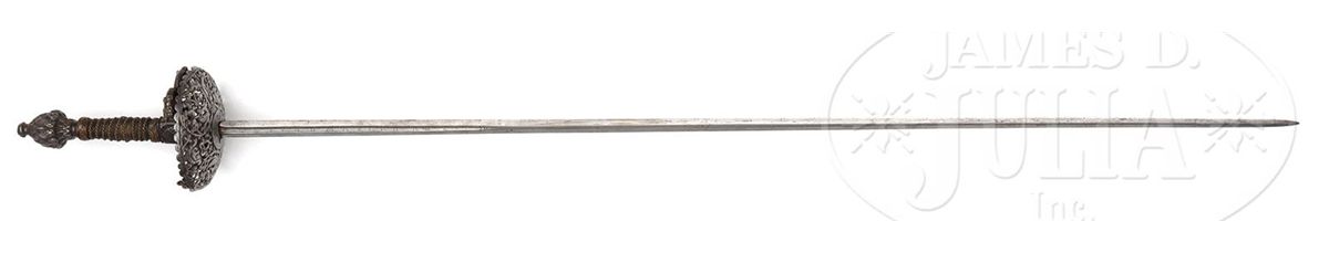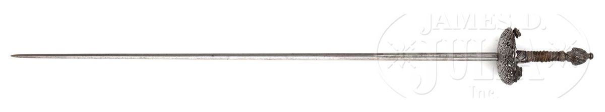 NSN. Dish is cast and chased with birds, grotesque masks and everted rim. Guard is chiseled with pineapple finials and scales. Grip is bound in copper chain and twisted copper wire with twisted copper turks heads. Pommel is cast and chiseled en suite with the guard in the form of a pineapple. Long lozenge-shaped rapier blade with fullers extending one-third of its length. PROVENANCE: Joe Kindig Jr. Original tag "Italian court sword with chisel hilt, 1650". CONDITION: Good overall with some pitting to dish. Grip is intact. Pommel and guard are preserved in good condition. Blade is in fine condition with only very minor pitting mostly towards the point. A most attractive dish hilt rapier with a distinguished provenance. 4-49156 MRZ76