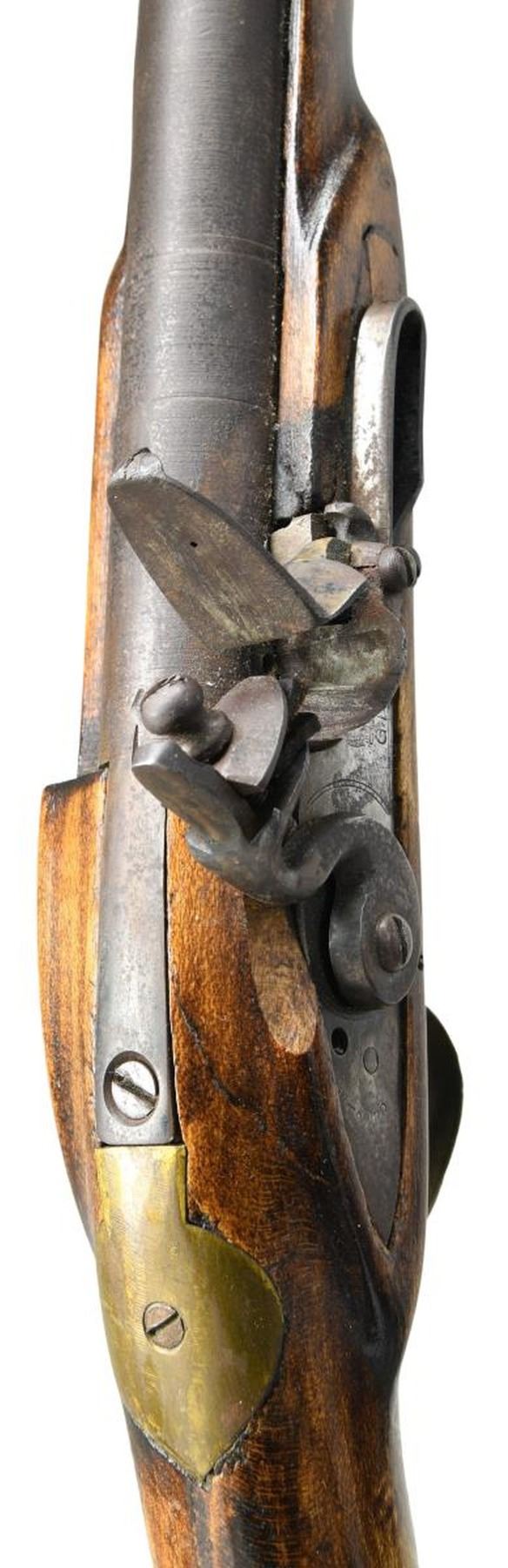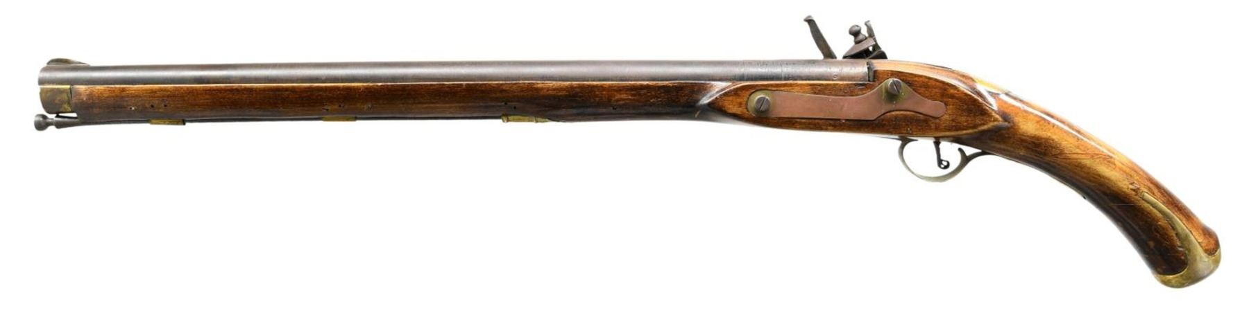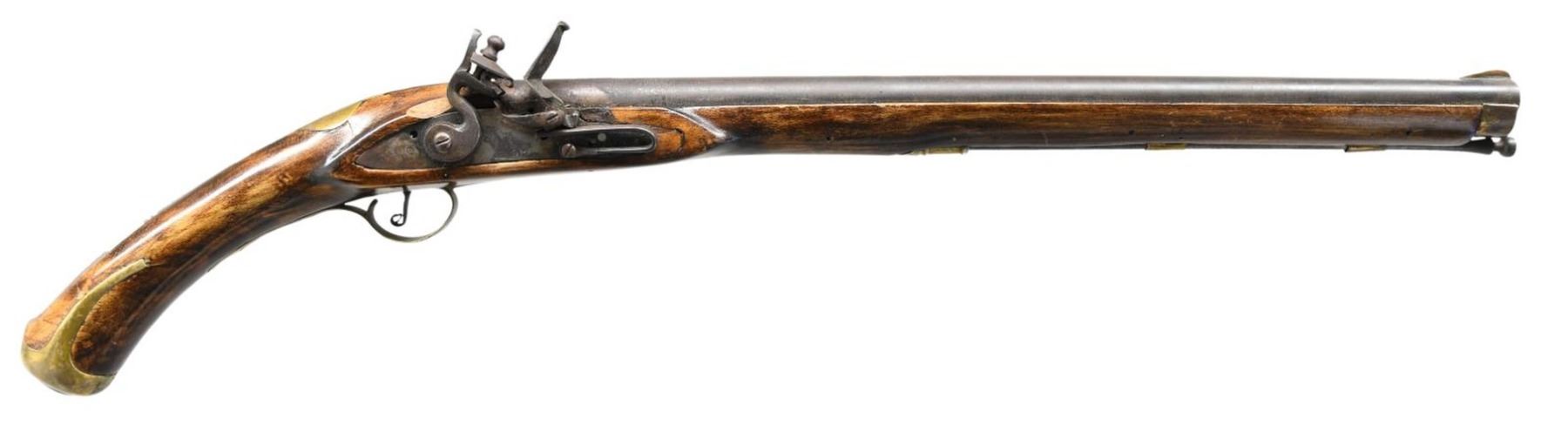 Cal. 60. NSN. Bbl. 19 1/2". Brass blade front sight. An assembled long-barrel flintlock pistol using a variety of parts. The center of the lock is marked with a British crown over "GR" and the rear of the lock is marked "TOWER". Top rear of the bbl. is marked with index marking and the letter "A". Lock is sluggish but functional when hand-cycled. Hardwood stock with brass furniture. Top of the grip has heart-shaped brass decoration. Replacement iron ramrod is secured by a thimble and two brass pipes. CONDITION: stock set has added varnish with a chipped area behind the lock from the hammer function, a couple notable repaired cracks on the front of the grip frame, a further repaired crack at the rear of the lock, scattered flaking, chipping, dings, and handling wear. Brass parts are a dull yellow color with scattered varnish overruns, oxidation, and dings. The balance of metal is a dark, oxidized patina, with areas appearing gray and some pitting. Very good, smooth bore with some light frosting and oxidation. (01-24417/MJC). ANTIQUE. $300-400.
