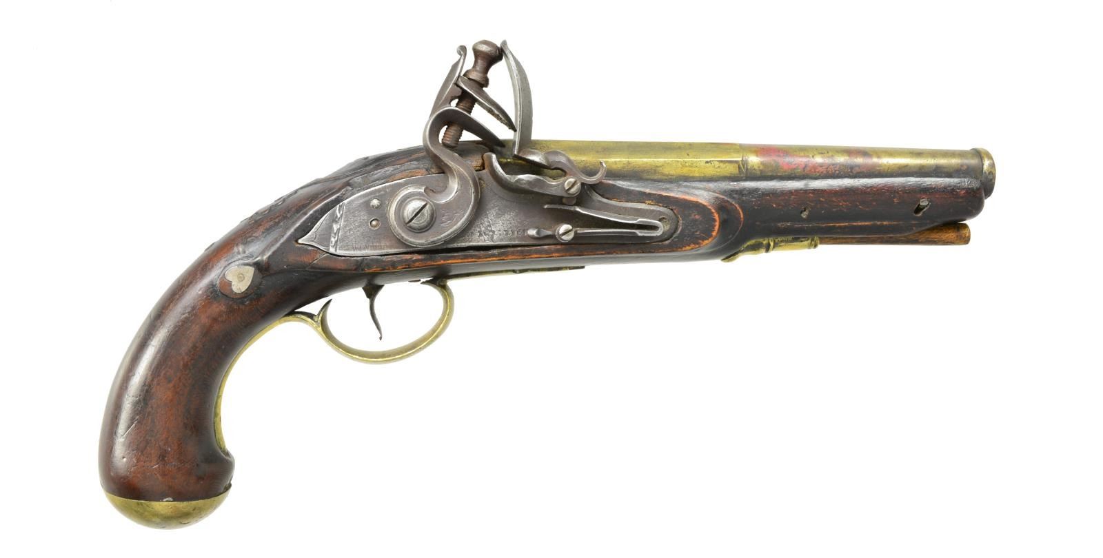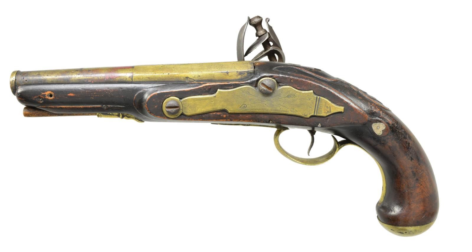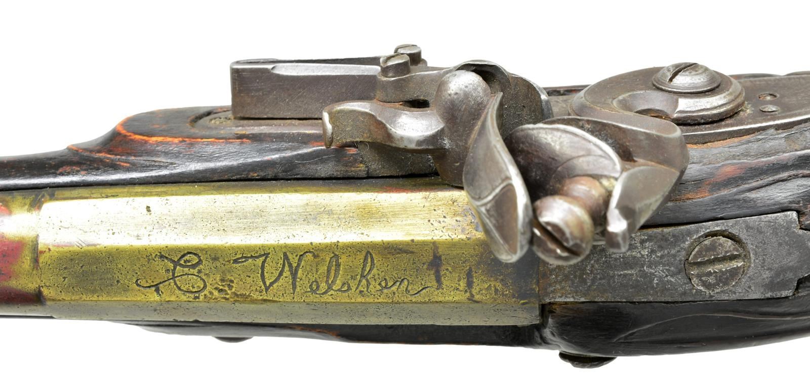 Cal. 42. NSN. 12" Overall. Bbl. 6 1/4" 2 stage brass oct. to rnd. tapered brass w/ cannon muzzle signed on top flat in script “C. WELSHEN”. Lock markings not discernible. Pistol is brass mounted w/ moldings, 2 sm. silver inset hearts in rear beaver tails either side. Stock is painted w/ a red lacquer or varnish. Crossed arrows are engraved on sideplate. CONDITION: good to very good overall as assembled, brass has mixed mustard patinas w/ red discoloration to rnd. portion of bbl. Markings on lock, bbl., & sideplate may have been added later. Small crack in bbl. at muzzle face. Mechanically functional w/ clear smooth bore. PROVENANCE: From the Collection of John "Tim" Breth Jr. (01-17769/JS). ANTIQUE. $2,000-3,000.