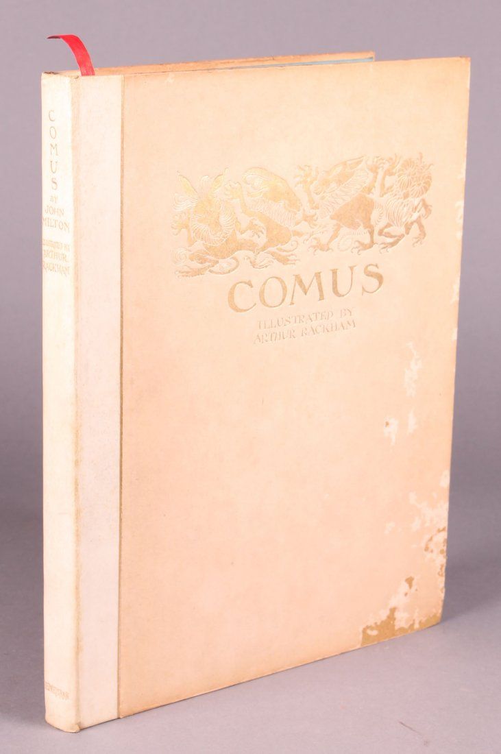 [Rackham, Arthur/Signed Drawings]. John Milton. COMUS. Illustrated by Arthur Rackham. Lon: William Heineman/ NY: Doubleday, Page & Co., (nd). [1911]. 4to. Original quarter vellum and boards, gilt-stamped front cover, teg. External chipping to covers. Minor foxing to covers, flyleaf, and eps. Flyleaf toned. 24 tipped-on color plates. 1st edition, #539 of 550, signed by Rackham on limitation leaf. Riall p143. Apart from the limitation, there are 2 original ink drawings & 1 ALS: [1] Ink drawing of a monster, signed by Rackham above the drawing's lower edge. Drawing is inscribed ?Dick Popper/ on his 21st birthday/ with all best wishes from the Rackham family/ 20.8.29.? [2] An ink drawing by Rackham, which was used to produce the illustration on p71. The ink drawing was signed in lower margin after the book?s publication (8 ?? x 6 ??). [3] Also placed in is an ALS by Rackham. Reads ?Dear Dick/ We hope you like to have this copy of Comus & also the original drawing which I enclose with it (facing its reproduction on p71)? Sincerely yours/ Arthur Rackham.?
