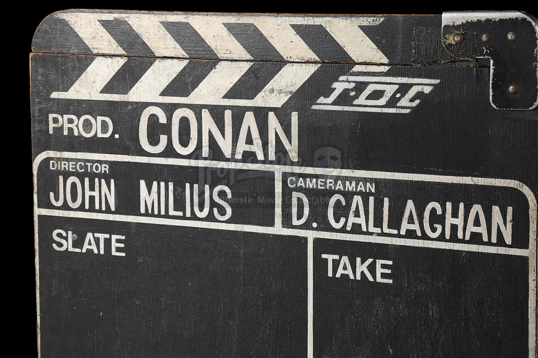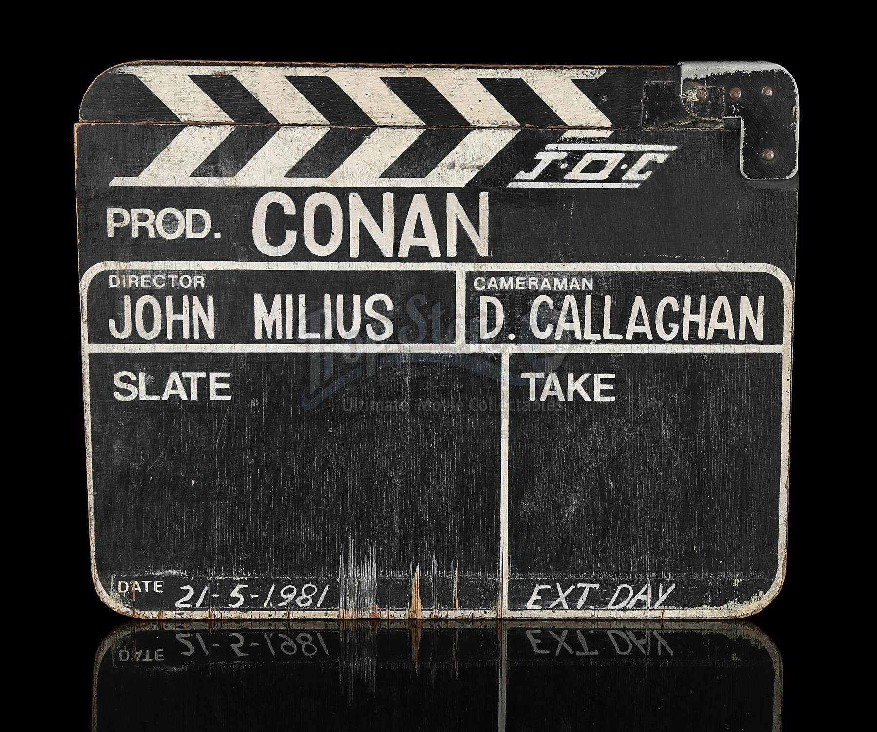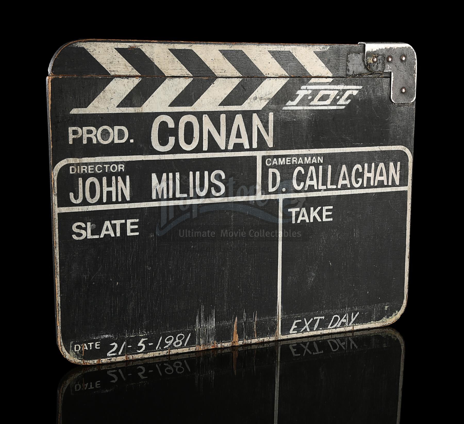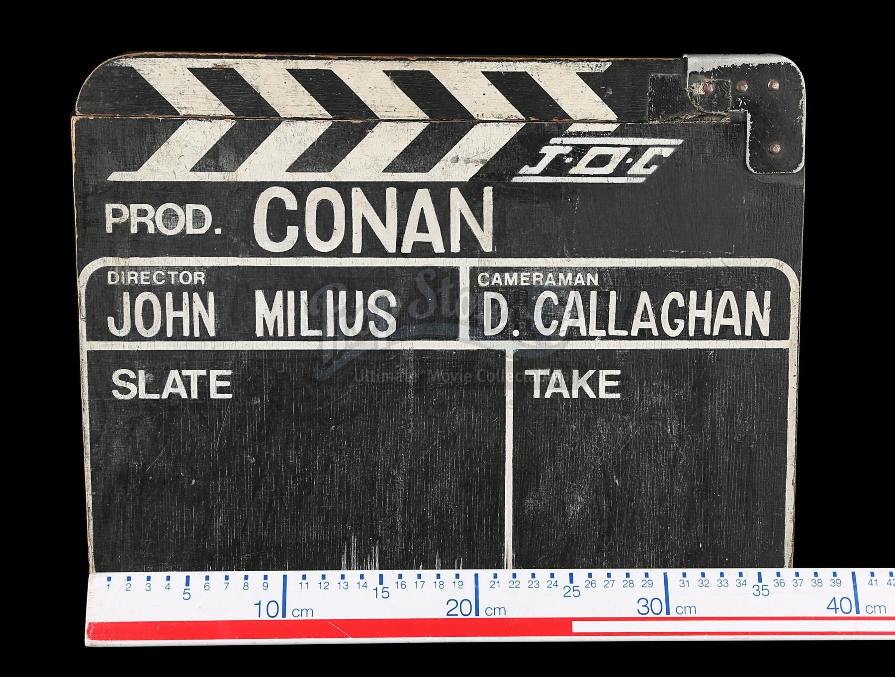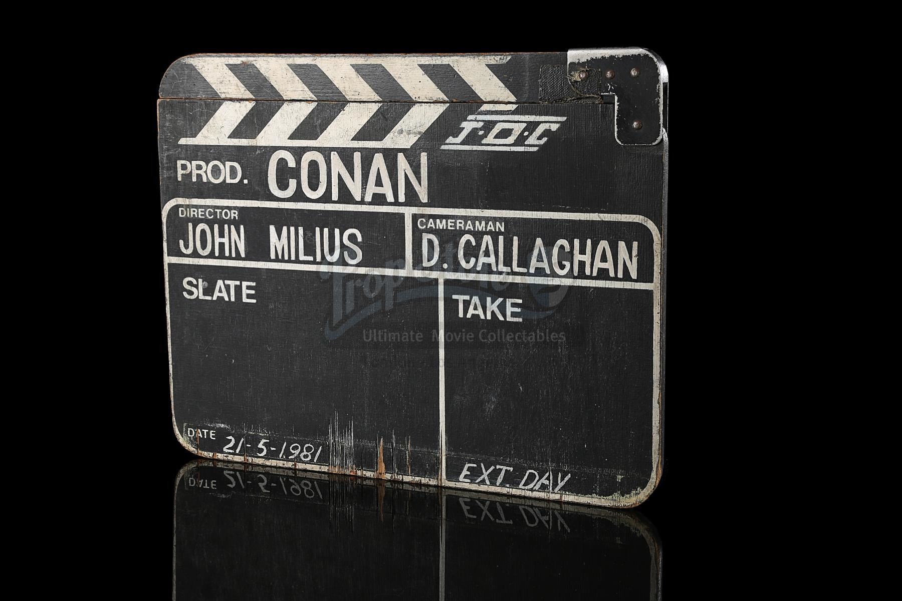 A clapperboard from John Milius' fantasy epic Conan the Barbarian (1982). This clapperboard can be matched by marks at the bottom of the plate to various behind-the-scenes photographs and footage from the making of the film.