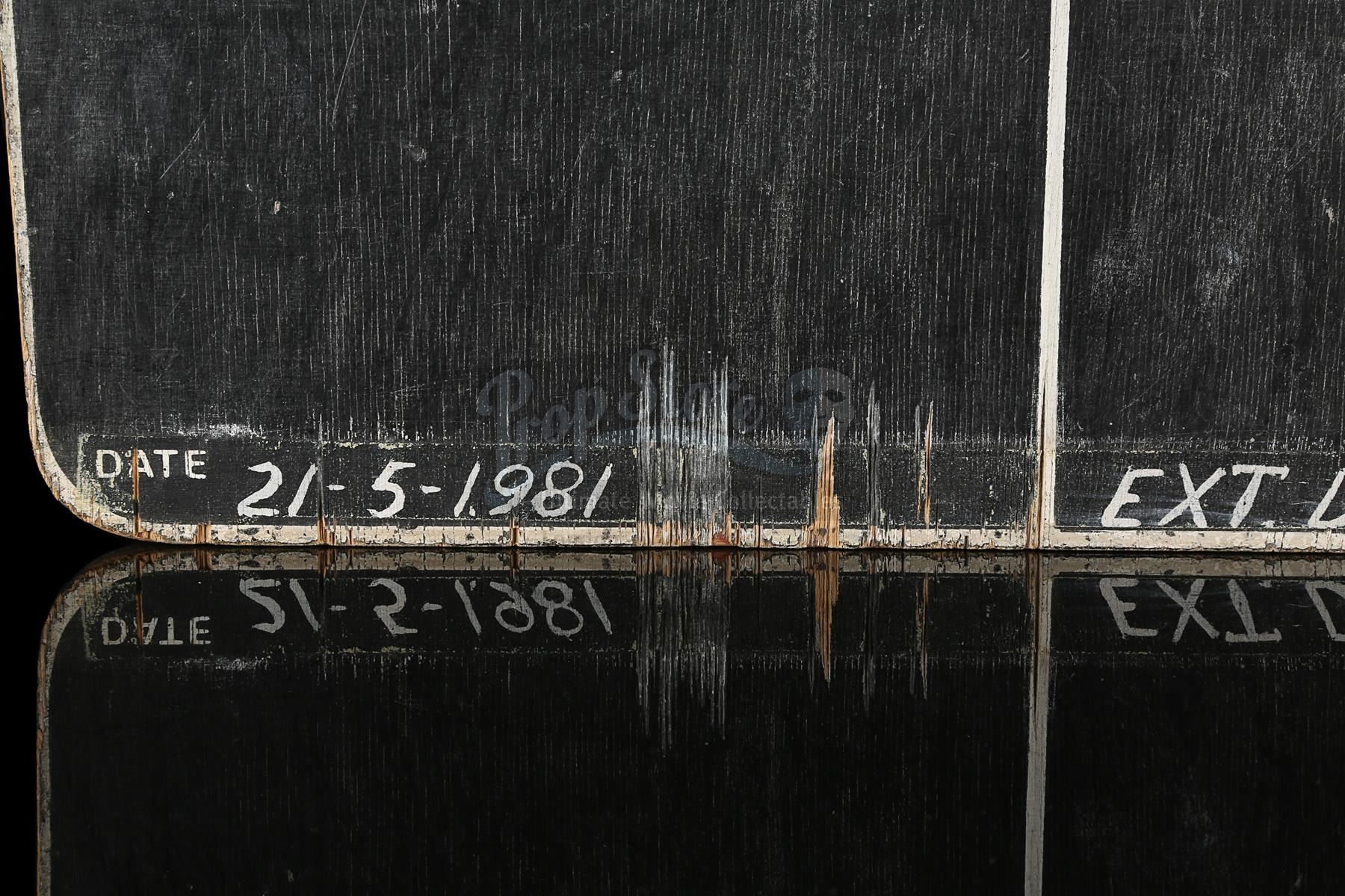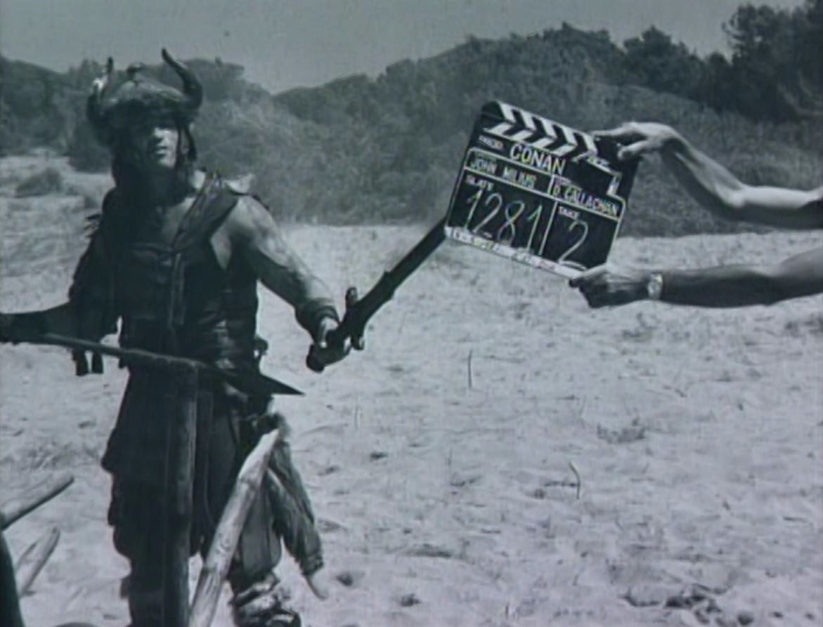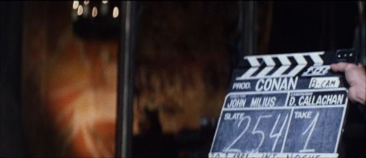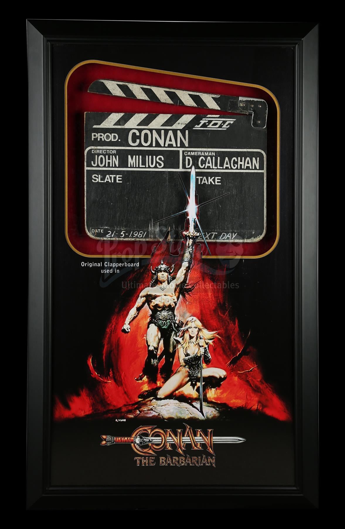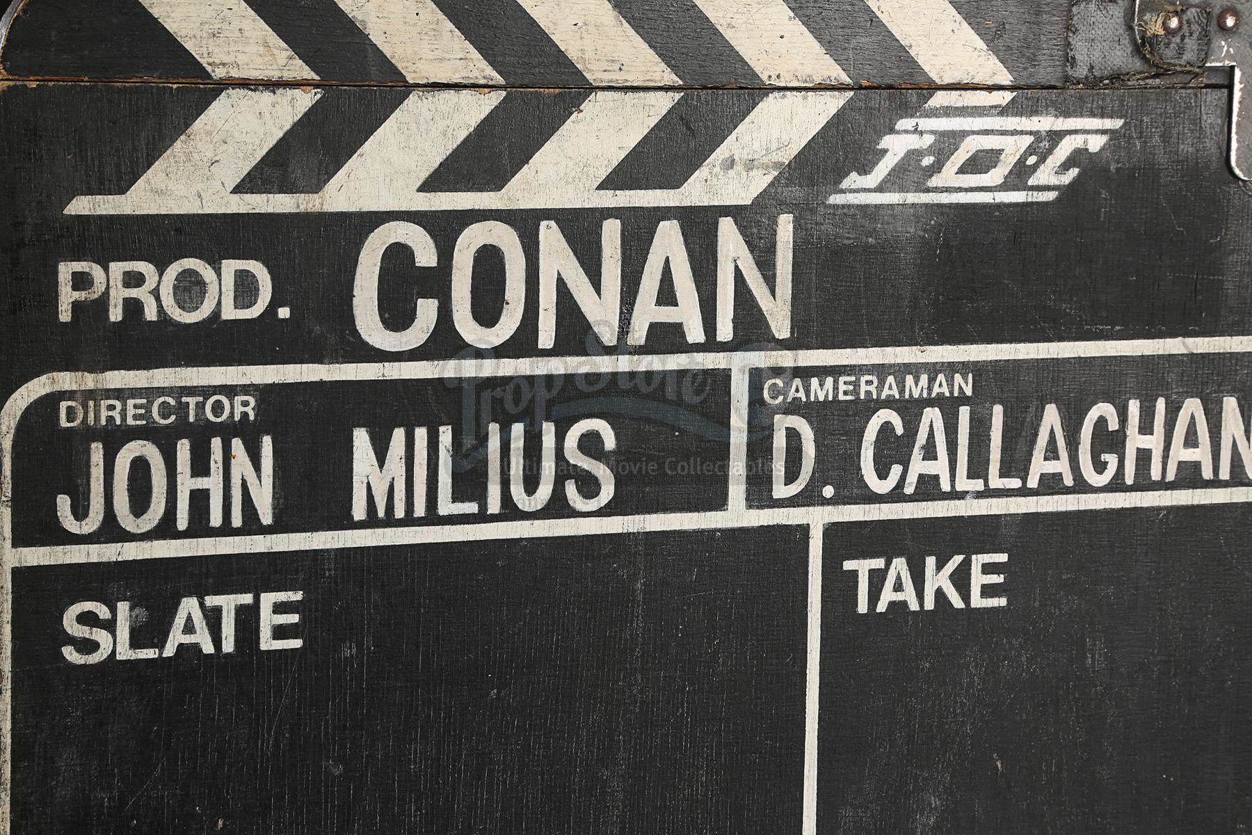 A clapperboard from John Milius' fantasy epic Conan the Barbarian (1982). This clapperboard can be matched by marks at the bottom of the plate to various behind-the-scenes photographs and footage from the making of the film.