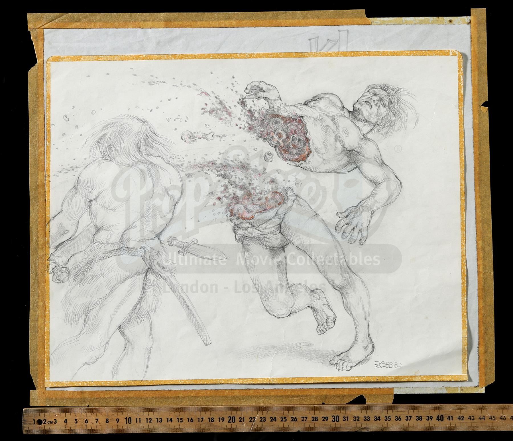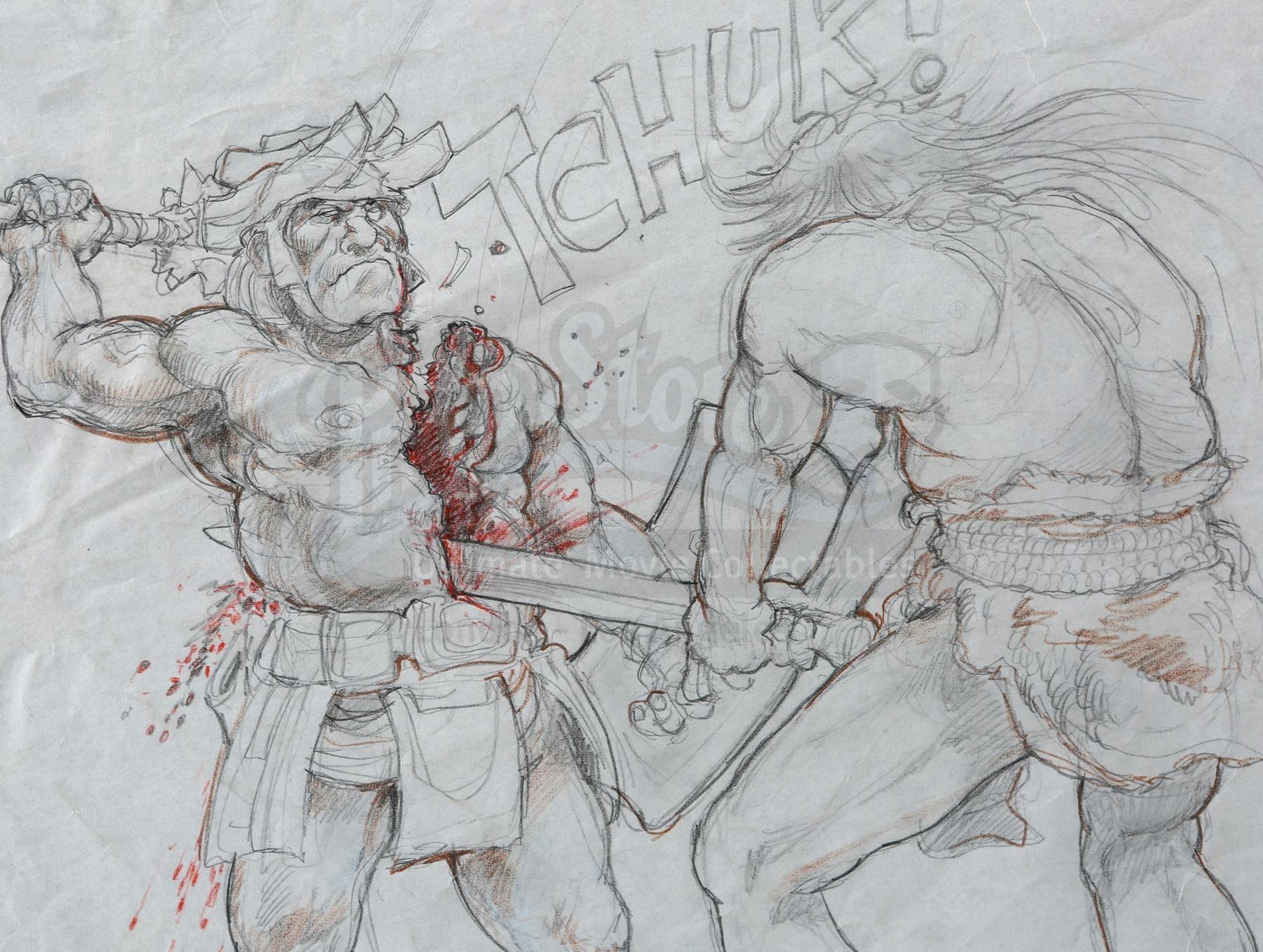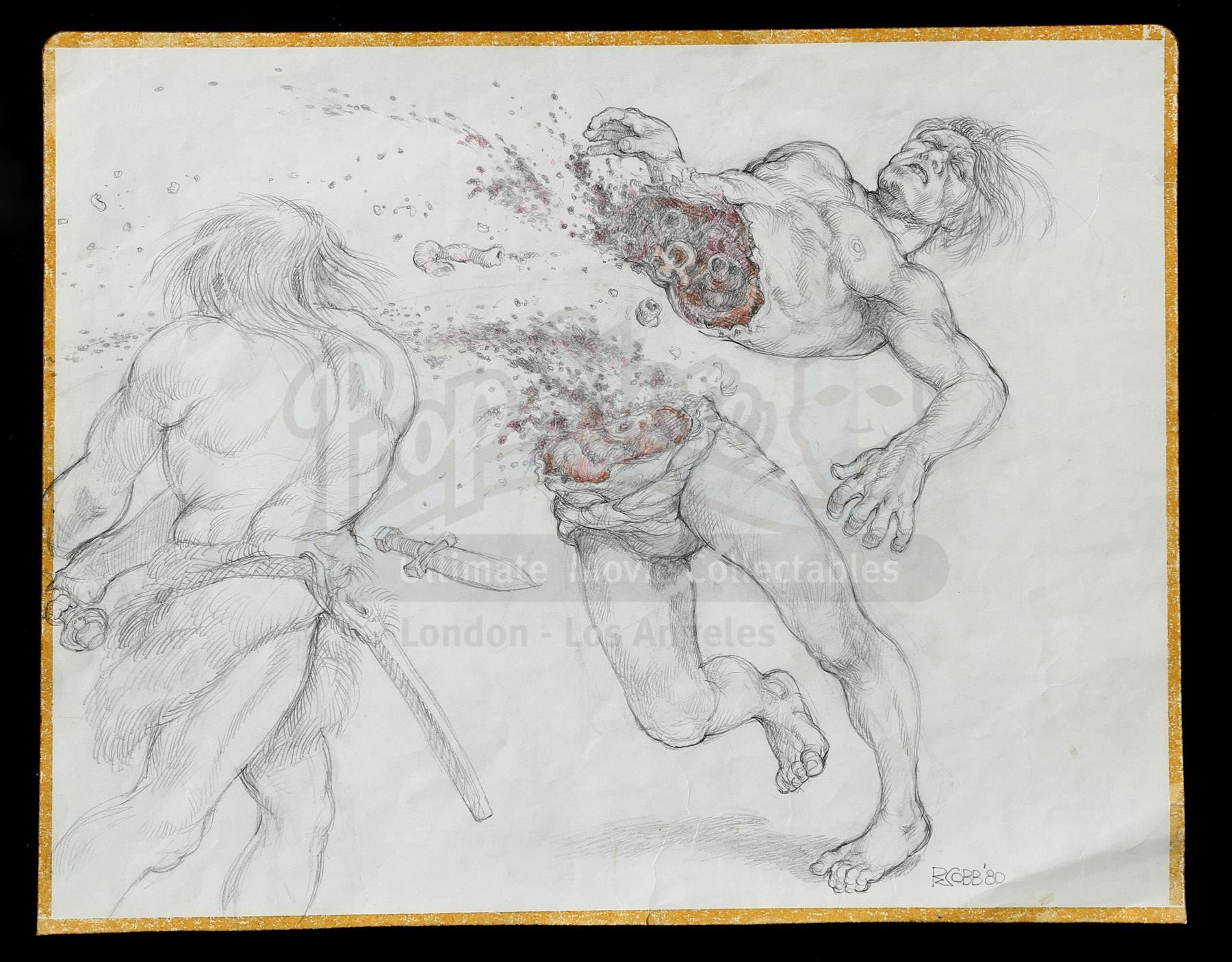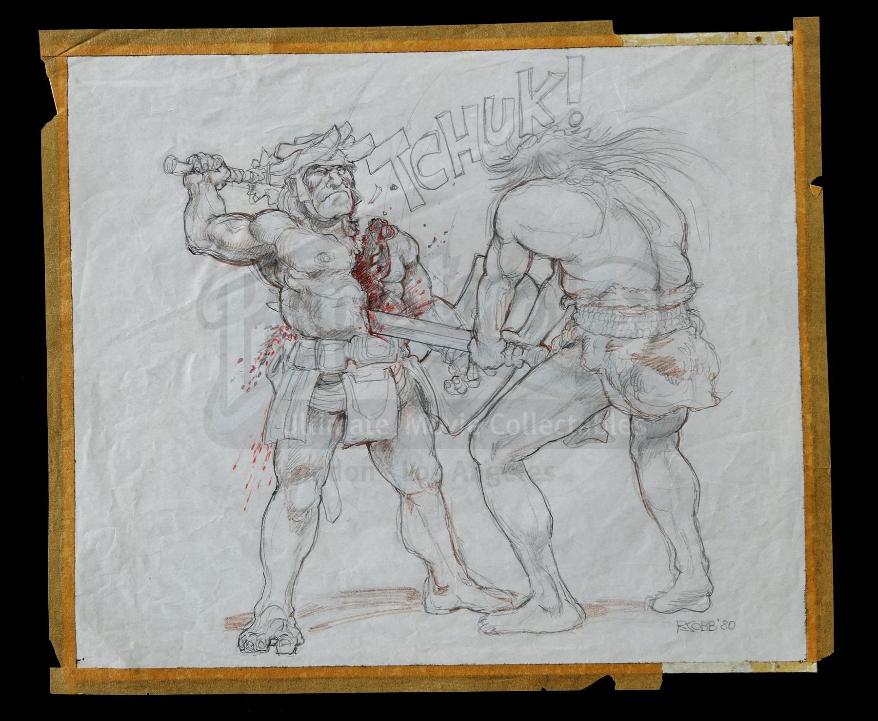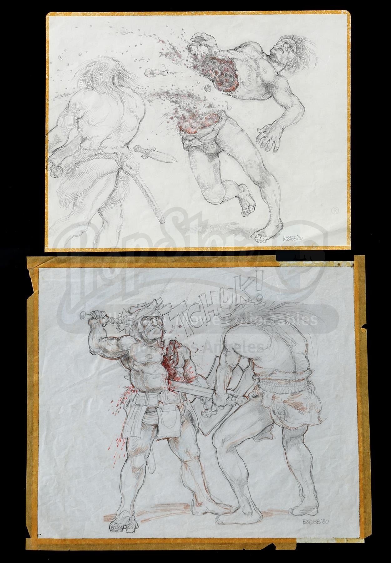 A pair of hand-drawn Ron Cobb bloody combat concept sketches from the production of John Milius' fantasy adventure Conan the Barbarian. Conan (Arnold Schwarzenegger) rose from slave to thief to fearsome warrior on his quest to avenge the murder of his family.