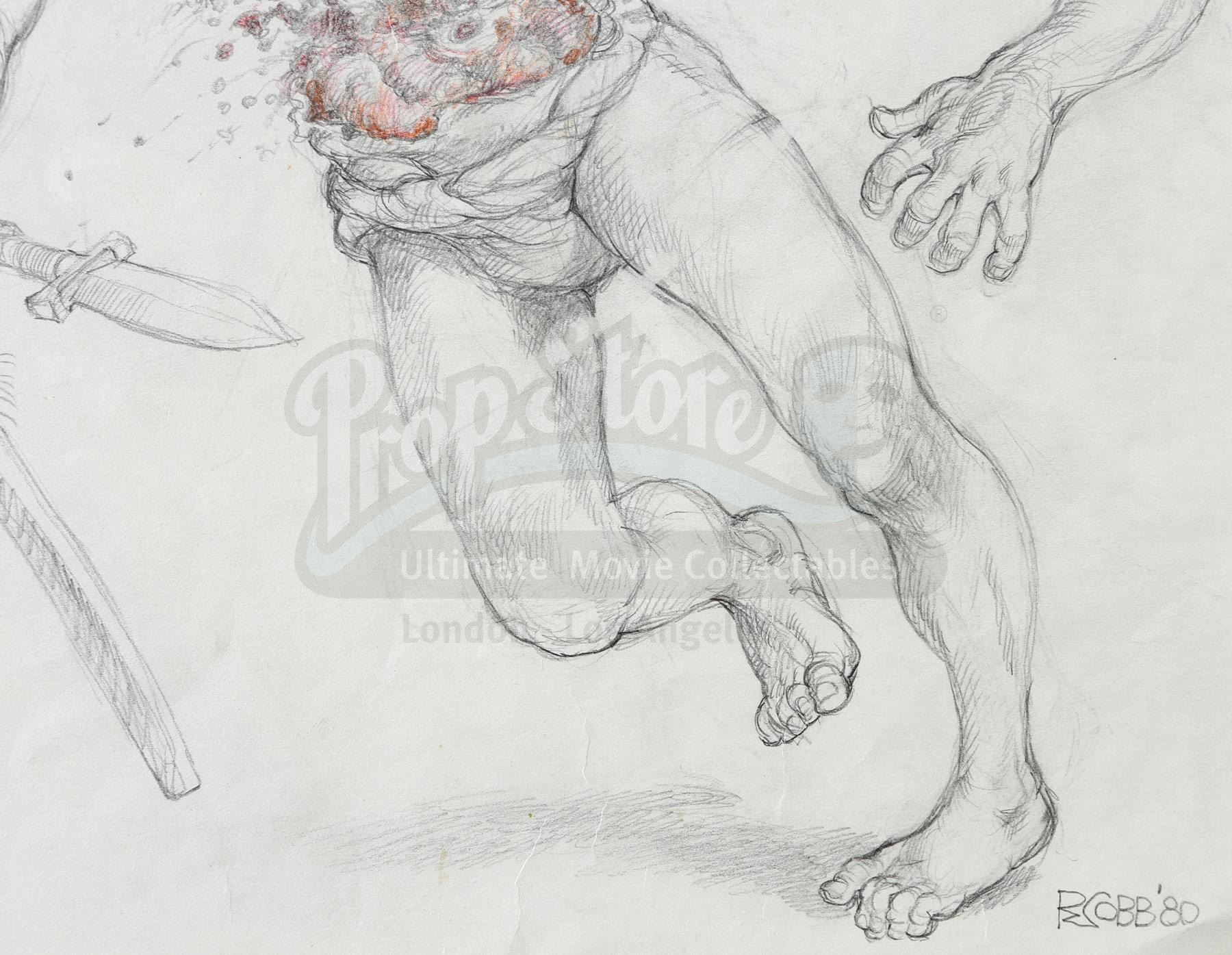 These hand-drawn concept sketches of Conan in battle are the work of the film's production designer Ron Cobb. Both are rendered in coloured pencil on white paper and signed "RCobb '80" on the lower right corner, and were created to help the production decide on the level of violence they wanted to depict in the film. These pieces exhibit some signs of wear and production use, including aged tape around the borders of one sketch, and glue remnants of removed tape around the border of the other. Dimensions (larger): 45.75 cm x 38.75 cm (18" x 15 1/4"); (smaller): 40.75 cm x 32.5 cm (16" x 12 3/4")