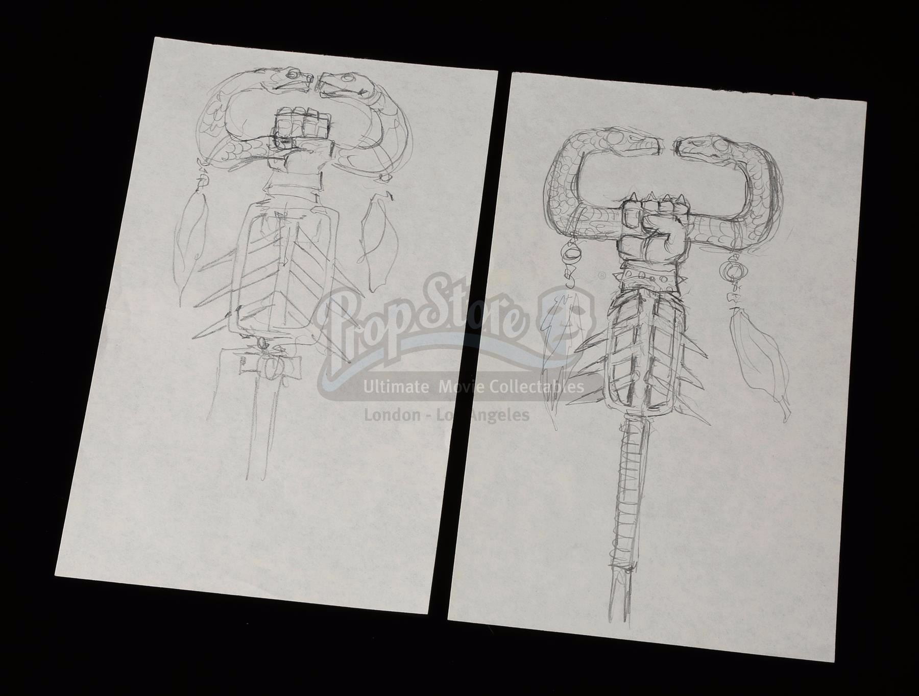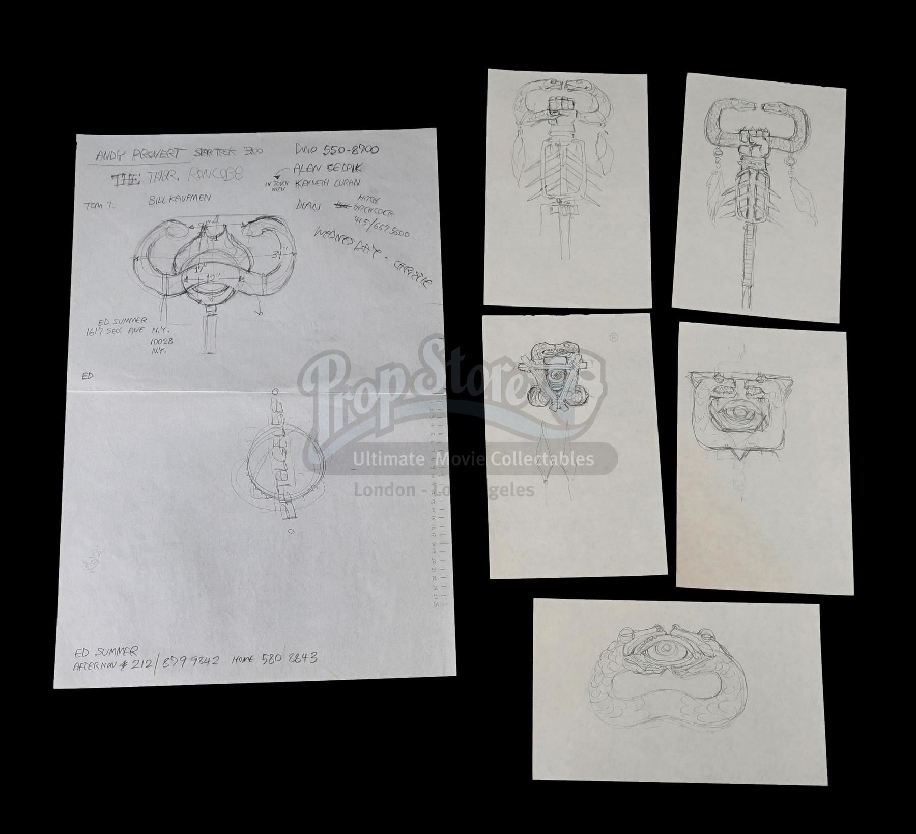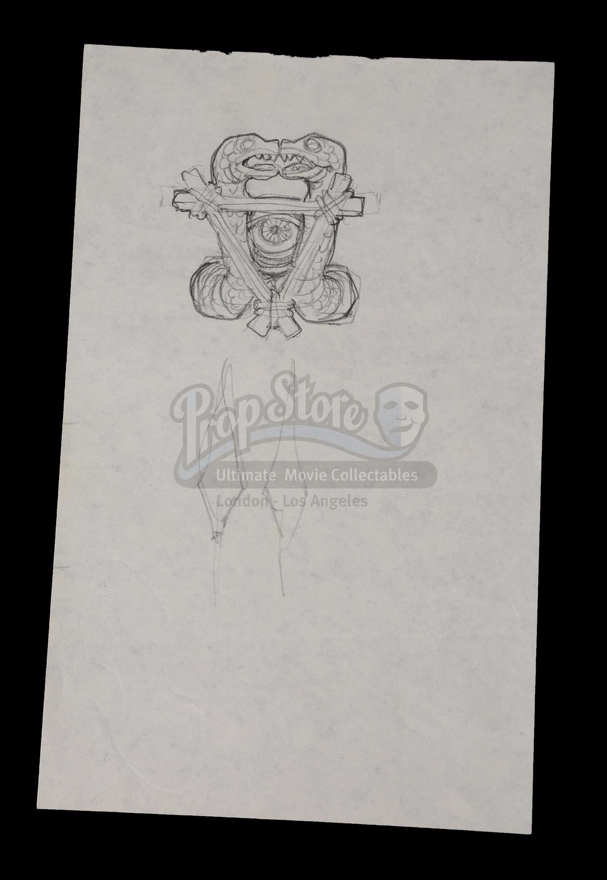A set of hand-drawn concept designs from John Milius' fantasy epic Conan the Barbarian (1982). The artworks, created by production designer Ron Cobb, depict the early designs for banners and emblems of the Cult of Set, led by the mystical warlord Thulsa Doom (James Earl Jones).