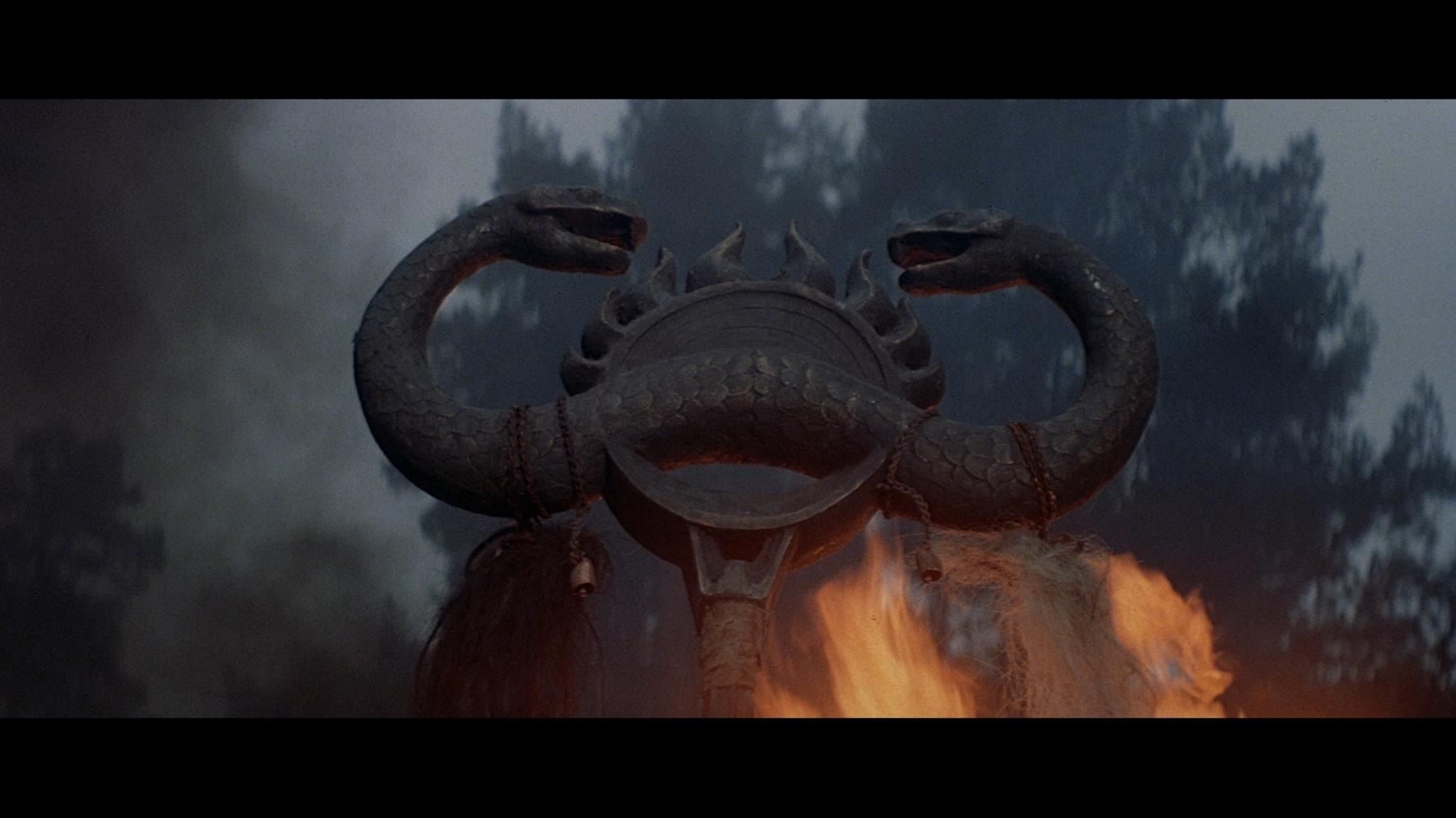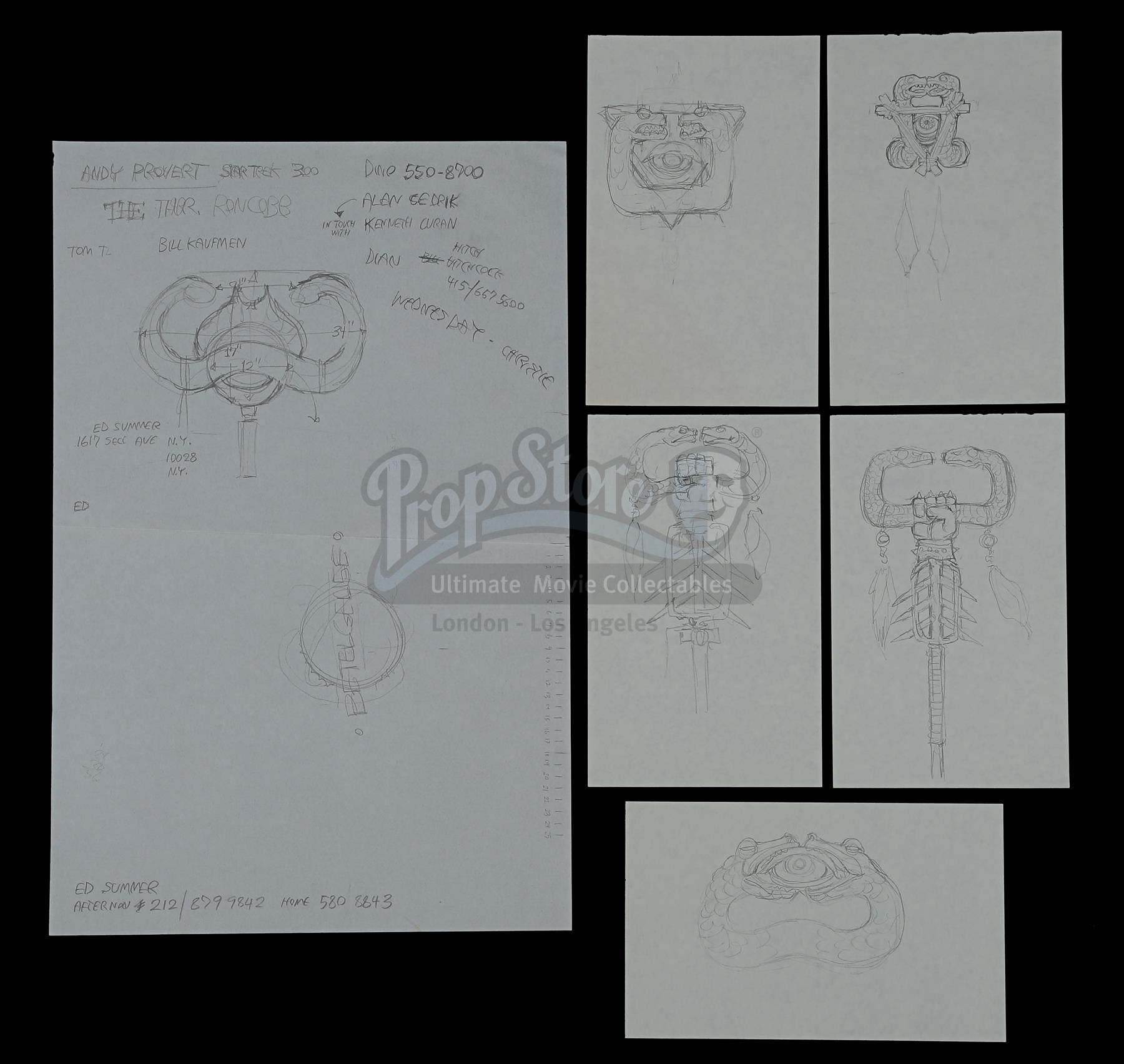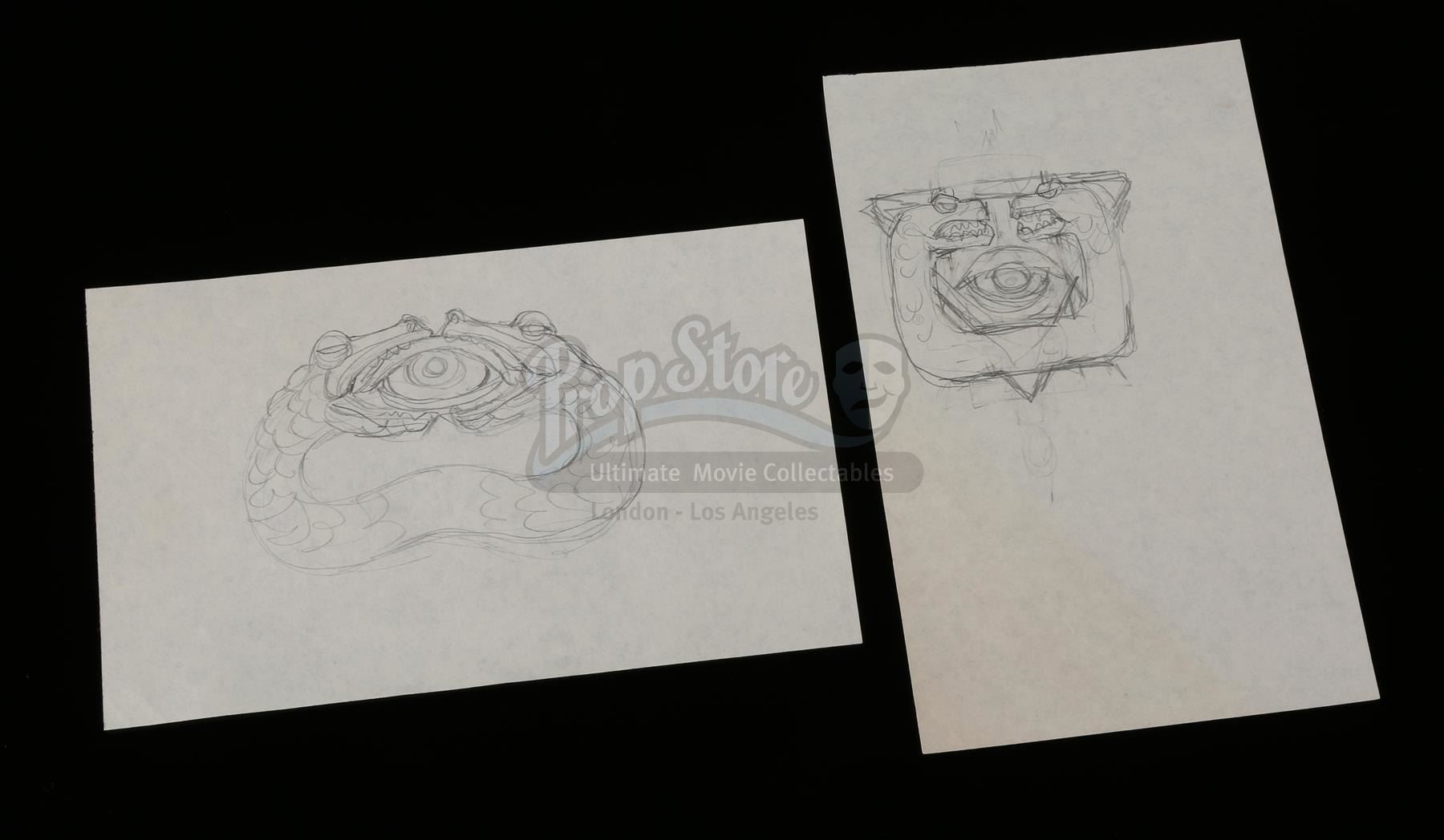 A set of hand-drawn concept designs from John Milius' fantasy epic Conan the Barbarian (1982). The artworks, created by production designer Ron Cobb, depict the early designs for banners and emblems of the Cult of Set, led by the mystical warlord Thulsa Doom (James Earl Jones).