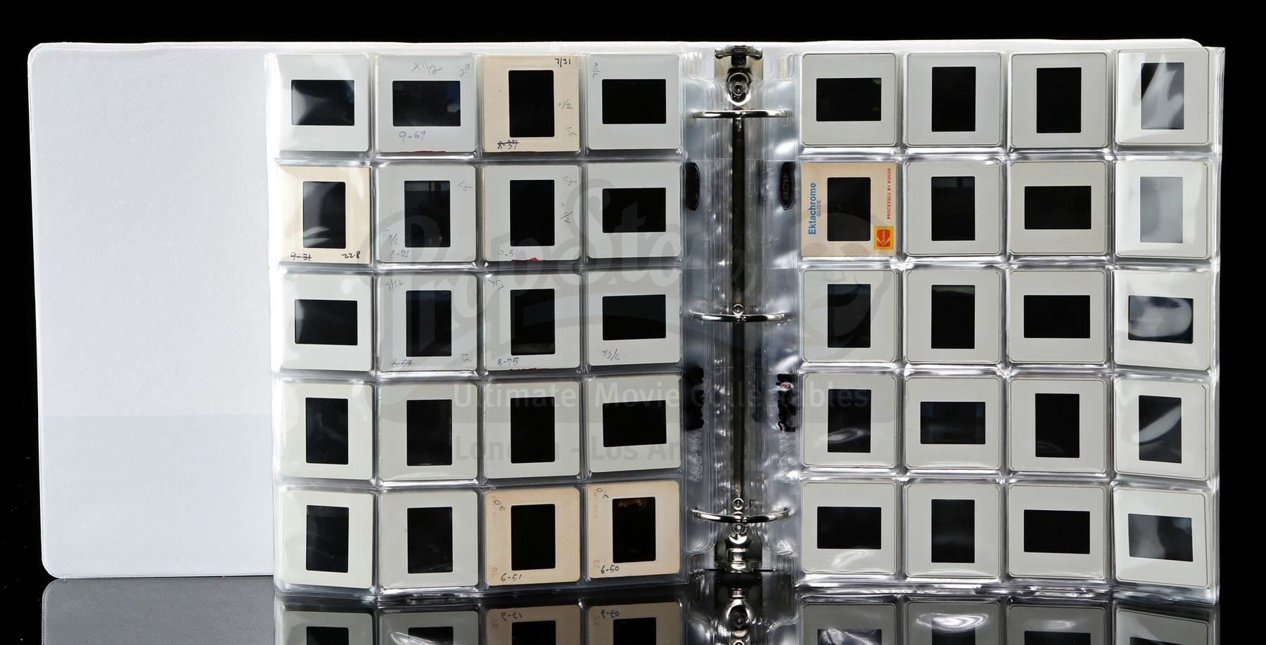 This white three-ring binder includes 33 plastic storage sheets containing 642 35mm Ektachrome and Kodachrome film slides showing behind-the-scenes images from various elements of the production including location scouting, set construction and interactions with the cast and crew, including Milius and Schwarzenegger. Also included are digital copy of scans of each slide, and eight of Cobb's original slide trays in boxes labelled for the film. Dimensions: 47 cm x 47 cm x 33.75 cm (18 1/2" x 18 1/2" x 13 1/4")