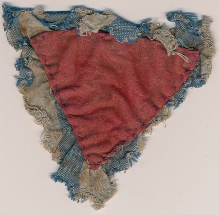 Red cloth triangle once affixed to a political prisoner's uniform while he was held a prisoner in either a prison camp or concentration camp in Nazi Germany. The triangle, approx. 2 3/4" long on each side, is still affixed to a small patch of blue and white fabric typical of that worn by camp inmates. The doubled red thread stitching is typical of that seen on authentic pieces, with staining and lint build-up typical of normal ageing. No sign of artificial ageing is evident. Political prisoners in Nazi Germany included communists, social democrats, and dissidents who posed a threat to the new regime and were unpopular with most other Germans.