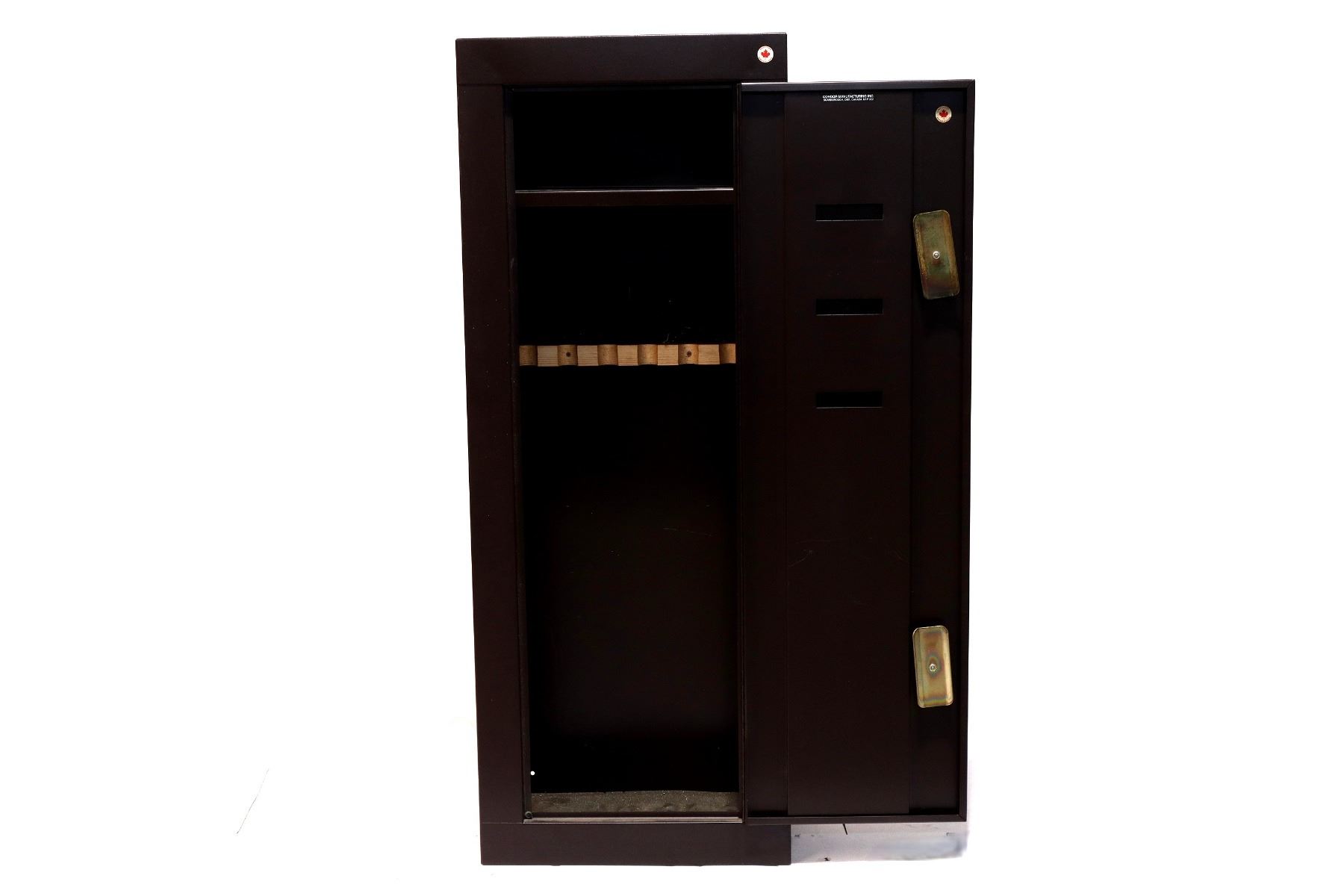 LOT INCLUDES; (1) BROWN METAL GUN CABINET, DOUBLE LOCK, WITH 1 KEYS, WOODEN BARREL RESTS, SHELF, APPROX. 21"X10"X55 1/4", LIGHT WEAR & TEAR, SEE PHOTOS,*PICK UP ONLY, NO SHIPPING*.