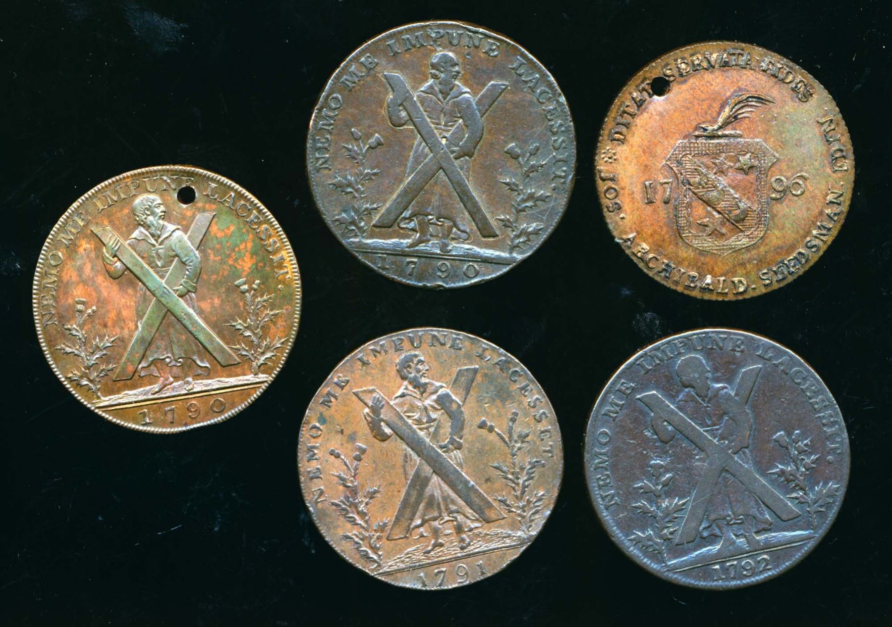 1 x 1796 Archibald's D&H# 10 holed 8.5 gm. VF, 3 x Hutchinson's (1 x 1790 D&H# 25 12.6 gm.holed AU, 1 x 1790 D&H# 23 12.3 gm. VF, 1 x 1792 D&H# 41 12.4 gm. F) and 1 x 1791 D&H# 50 10.2 gm. VF.