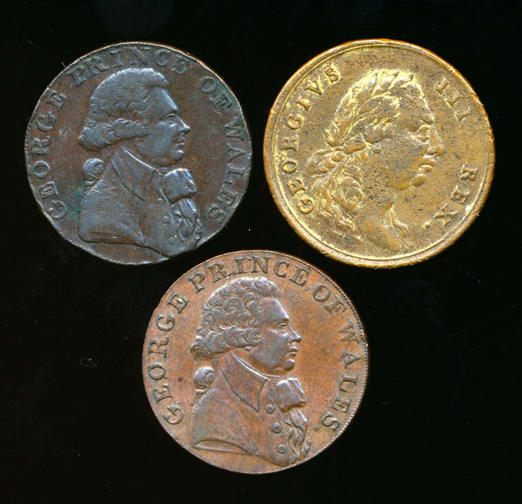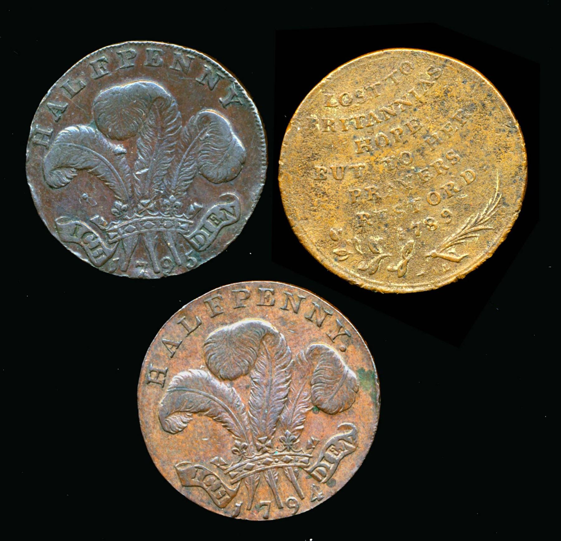 1 x 1789 D&H# 932 7.9 gm. was gold plated F, 1 x 1795 D&H# 963b 9.7 gm. VF+ and 1 x 1794 D&H# 965 9.3 gm. with Edge: HALFPENNY WARLEY CAMP XXX (not listed in D & H) VF+