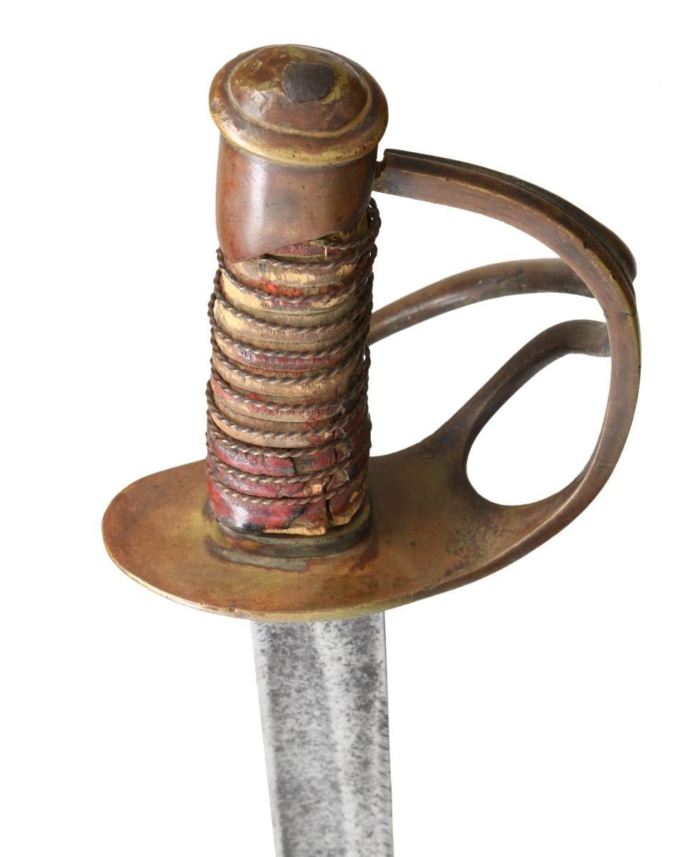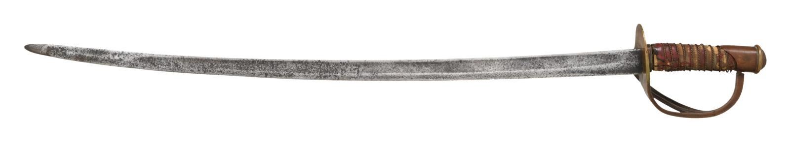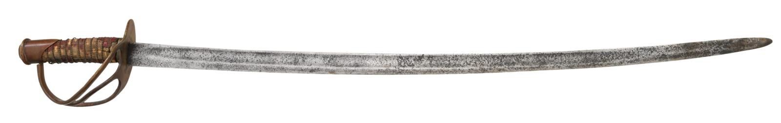 31" unstopped fuller blade, characteristic Hammond Marshall small cavalry branched hilt with small brass ferrule. This pattern often thought to be KG&G as Marshall & Kraft, Goldsmidt & Kraft are very similar. CONDITION: good overall, blade cleaned with mottled pitted iron patina. Hilt & pommel have coppery patina. Carved wood grip has remnants of red painted leather and complete twisted brass wire wrap. (02-19108/JS). $1,500-1,800.