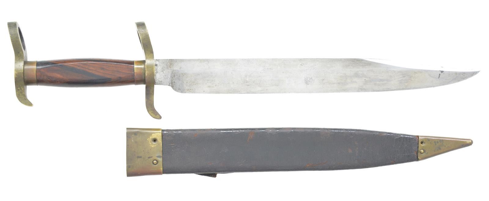 OF COOK & BROTHER OF NEW ORLEANS. This is a very fine example of a classic Confederate bowie made w/ 2 unfinished brass muzzle rings, well finished rosewood grip, 12 1/2” clip point blade & original brass mounted sheath. Norm Flayderman in his monumental text “The Bowie Knife” “the only mention of the term “Bowie-Bayonet” in literature leading up to the Civil War is made by U.S. admiral John Dahlgren who coined the term for his knife used on a navy rifle". His lesser known brother Confederate General Charles Dahlgren notes in early war telegrams that he wishes “Bowie knives put on guns, Cook in New Orleans can do it” & in a second telegram a few days later he wishes the bowie knives not get put on guns. This explains the reason for such variation in the “muzzle rings” or lack of muzzle rings plus filed muzzle rings. Rosewood is never seen on Confederate weapons w/ the exception of this genre of bowie. New Orleans is well known however for the use of rosewood, antebellum bowies & surgical tools. The use of “punch marks” & pins to secure scabbard mts. is also seen in marked Cook cutlass scabbards. It would be difficult to find a better complete example of this Confederate bowie. CONDITION: very good to fine overall; blade is gray/bright w/ light staining, brass mts. to grip & sheath have mixed dark mustard patina, leather sheath body is sound & solid retaining most of its original finish w/ scuffing & chipping, original 4” sewn belt loop is complete but broken at one end, sheath mts. are punched & pinned; missing 4 pins. (02-13591/JS). $3,000-4,000.