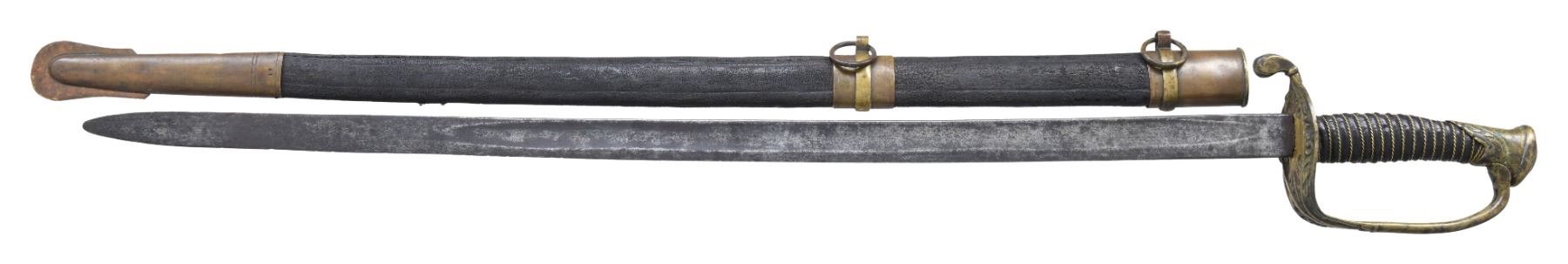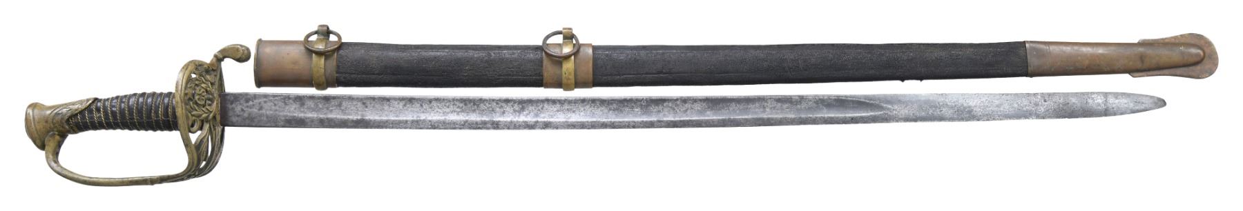 OFFICER'S SWORD. Overall length: 36 1/4". Blade length: 28". A good honest example of a Civil War Confederate Boyle & Gamble style staff and field officer's sword. This style of sword was also produced and/or sold by Mitchell and Tyler as well as Berger Brothers. This fact allows for small variations in various details of their respective swords. The plain blade has a single wide, unstopped fuller. The brass hilt has a pierced foliate guard with a central "CS" and star above. The underside of the guard is stamped "7" on one side and "31" on the other side. The foliate decoration extends a short way up the knuckle bow that splits, forming a sword knot slot. The pommel has a crude acanthus leaf decorated front with a plain 3-step pommel. Wire wrapped leather grip. Excellent top stitched correct scabbard with correct plain band sword mounts. The matching drag is stamped "51" on the top. CONDITION: the blade has a dark mottled patina but shows only traces of pitting. The tip is slightly rounded. The hilt has a pleasing early patina and is free from notable damage. The grip shows minor losses and shrinkage but the wire is complete. The scabbard remains quite strong and robust with no damage or repairs. The leather, itself, is a bit dry and somewhat crazed. Mounts are undamaged and show a beautiful mellow patina. (02-23931/BF). $8,500-11,000.