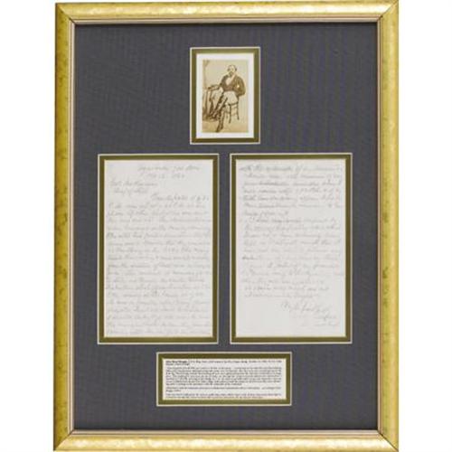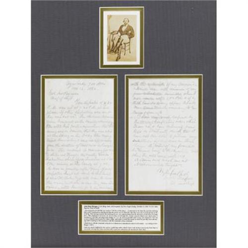 <B>CONFEDERATE BRIG. GEN. JOHN HUNT MORGAN: A SUPERB WAR-DATE LETTER WITH EXCELLENT MILITARY CONTENT</B></I>. Autograph Letter Signed in pencil, two pages, Octavo, Cogers Landing, October 12, 1862, to Col. John Pegram, Chief of Staff. Signed “<I>Respectfully, Jno. H. Morgan, Col. Comd. Brigd.</B></I>” It reads:<BR><BR>“<I>Your dispatch of 4:30 P.M. was read at 7:20P.m. at this place…I remained on the Danville and Harrodsburg Pike until I read positive information that the enemy were in Danville, that they were also at Cold Spring on the D & Hg. Pike moving towards Harrodsburg & were also approaching from the direction of Salt River in large force. This rendered it necessary for me to strike out through the country towards Shakertown which place I reached at 5:20 P.M. arriving at this landg. At 7. oc. As soon as possible after recvg. your dispatch I sent out scouts to Shakertown & also Col. Duke’s Regt. with orders to hold the enemy in check in case they were advancing until I could go to his assistance with the remainder of my command.<BR><BR>I Shall move with the remainder of my force to Shakertown immediately where I will remain…according to Gen. Bragg’s orders.<BR><BR>I am very much confused by the various conflicting orders which I have read, & have necessarily been kept so constantly moving that I have not been able to procure subsistence for my men for three days…”</B></I><BR><BR>One of the more illustrious (or notorious, depending on one’s allegiance) Confederate military figures, Morgan had organized three companies of cavalry that raided extensively in Tennessee, Ohio, and Indiana before his capture in 1863. He was killed in his sleep in 1864 in Tennessee. Morgan’s signature is rare in any form, and such a fine-content war-dated letter presents a truly exceptional opportunity. The letter is in beautiful condition with very strong, clear handwriting; unlike many inks of the period, pencil does not fade or smudge. Beautifully custom matted and framed with a neat transcription and a reproduction of a portrait <I>carte de visite</B></I>. Truly a prize for the sophisticated collector of Confederate manuscripts or generals’ autographs.<BR><BR><b>Shipping:</b> Framed - without Glass, Medium (<a target="_blank" href="http://www.heritageauctions.com/common/shipping.php">view shipping information</a>)