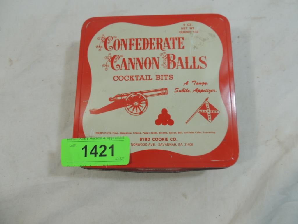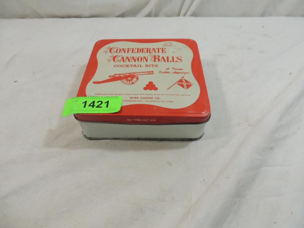 CONFEDERATE CANNON BALLS COCKTAIL BITS TIN, APPETIZER TIN, VINTAGE BOX, AS SHOWN SEE PHOTO FOR MORE DETAILS.